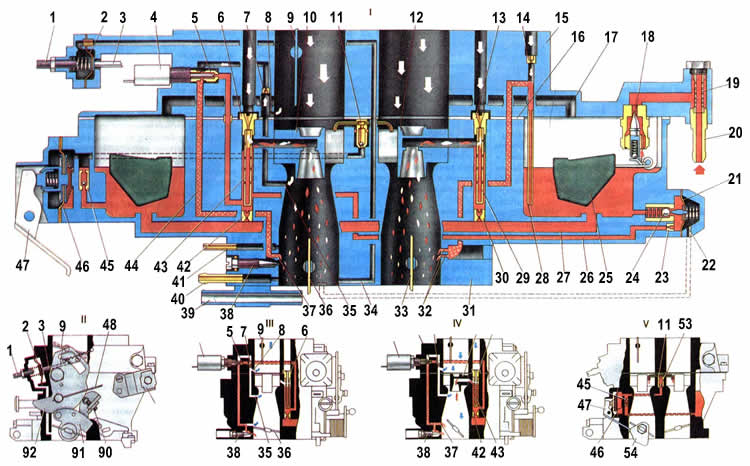 | Главная дозирующая система запитывается из поплавковой камеры, в которую топливо поступает через игольчатый клапан 18. Через главные топливные жиклеры 42 и 30 топливо поступает в эмульсионные колодцы. При достаточных разрежениях в распылителях главных дозирующих систем топливо смешивается в эмульсионных колодцах с воздухом, поступающим через главные воздушные жиклеры 6 и 13, и в виде эмульсии всасывается в диффузоры смесительных камер. На режиме дросселирования работает только главная дозирующая система первой камеры. Вторая начинает открываться и работать, когда дроссельная заслонка первой камеры откроется более чем на две трети. Система холостого хода обеспечивает необходимый состав горючей смеси на холостом ходу. При этом дроссельные заслонки 36 и 33 закрыты. Топливо с эмульсионного колодца главной дозирующей системы поднимается по топливному каналу, проходит топливный жиклер 5, смешивается с воздухом из воздушного жиклера 7 и проточного канала и далее поступает под винт 38 качества смеси в задроссельное пространство. Переходная система первой камеры обеспечивает плавный переход работы двигателя с холостого хода на режимы дросселирования. В момент открытия дроссельной заслонки первой камеры щель 37 переходной системы попадает под разрежение. Из нее также будет поступать эмульсия, обеспечивая плавный переход. Переходная система второй камеры обеспечивает плавный переход работы двигателя в момент начала открытия дроссельной заслонки второй камеры. В этот момент отверстия 32 попадают под разрежение; топливо из поплавковой камеры через жиклер 28 поднимается по трубке вверх, из воздушного жиклера 14 подмешивается воздух и эмульсия по эмульсионному каналу поступает через выходные отверстия под дроссельнук заслонку. Экономайзер мощностных режимов предотвращаем изменение степени обогащения смеси за счет пульсации разрежения под дроссельной заслонкой, особеннс при уменьшении частоты вращения коленчатого вала, когда возрастает пульсация и уменьшается разрежение. Шариковый клапан 24 экономайзера закрыт, пока диафрагма 21 удерживается разрежением под дроссельной заслонкой. При значительном открытии дроссельной заслонки 36 разрежение несколько снижается, и пружина диафрагмы открывает клапан. Топливо проходит через клапан, жиклер 23 экономайзера, добавляется к топливу, проходящему через главный топливный жиклер 42, и выравнивает обогащение смеси. Ускорительный насос диафрагменного типа, с приводом от кулачка на оси дроссельной заслонки первой камеры. При резком открытии дроссельной заслонки кулачок нажимает на рычаг 47 и через пружину в толкателе действует на диафрагму 46, преодолевая сопротивление возвратной пружины. Диафрагма подает топливо через шариковый клапан подачи и впрыскивает его через распылители 11 в смесительные камеры. При обратном ходе диафрагмы под действием возвратной пружины из поплавковой камеры засасывается топливо через обратный шариковый клапан 45 в рабочую полость ускорительного насоса. Кулачок 54 имеет специальный профиль, который обеспечивает двойной впрыск. Причем второй впрыск совпадает с началом открытия дроссельной заслонки второй камеры. Пусковое устройство обеспечивает приготовление богатой горючей смеси при запуске холодного двигателя. При повороте рычага 52 управления возду