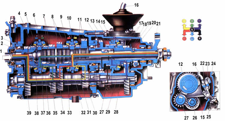 1. Первичный вал; 2. Вторичный вал; 3. Шестерня постоянного зацепления первичного вала; 4. Зубчатый венец синхронизатора IV передачи; 5. Скользящая муфта синхронизатора III и IV передач; 6. Вилка включения III и IV передач; 7. Шестерня и зубчатый венец синхронизатора III передачи; 8. Шестерня и зубчатый венец синхронизатора И передачи; 9. Скользящая муфта синхронизатора I и II передач; 10. Вилка включения I и II передач; 11. Шестерня и зубчатый венец синхронизатора I передачи; 12. Шестерня заднего пода; 13. Ступица муфты синхронизатора V передачи; 14. Скользящая муфта синхронизатора V передач; 15. Вилка включения V передачи и заднего хода; 16. Рычаг переключения передач; 17. Шестерня и зубчатый венец синхронизатора V передачи; 18. Втулка шестерни V передачи; 19. Маслоотражательная шайба; 20. Ведущая шестерня привода спидометра; 21. Фланец эластичной муфты; 22. Шток вилки включения V передачи и заднего хода: 23. Шток вилки включения III и IV передач; 24. Шток вилки включения I и II передач; 25. Включатель фонаря заднего хода; 26. Шестерня заднего хода блока шестерен; 27. Промежуточная шестерня заднего хода; 28. Блок шестерен V передачи и заднего хода; 29. Ось промежуточной шестерни заднего хода; 30. Шестерня I передачи промежуточного вала; 31. Блокирующее кольцо синхронизатора I передачи; 32. Ступица муфты синхронизатора I и II передач; 33. Блокирующее кольцо синхронизатора И передачи; 34. Шестерня И передачи промежуточного вала; 35. Шестерня III передачи промежуточного вала; 36. Блокирующее кольцо синхронизатора III передачи; 37. Ступица муфты синхронизатора III и IV передач; 38. Блокирующее кольцо синхронизатора IV передачи; 39. Шестерня постоянного зацепления промежуточного вала.