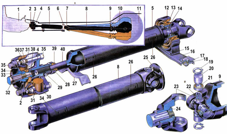 1. Коробка передач; 2. Передний фланец эластичной муфты; 3. Эластичная муфта; 4. Задний фланец эластичной муфты; 5. Передний карданный вал: 6. Опора карданного вала; 7. Передний карданный шарнир; 8. Задний карданный вал; 9. Задний карданный шарнир; 10. Задний мост; 11. Ведущее колесо автомобиля; 12. Подушка опоры; 13. Корпус подшипника опоры; 14. Подшипник карданного вала; 15. Кронштейн опоры; 16. Поперечина промежуточной опоры: 17. Дистанционная втулка; 18. Резиновая втулка; 19. Стопорное кольцо игольчатого подшипника; 20. Игольчатый подшипник; 21. Сальник игольчатого подшипника; 22. Крестовина карданного шарнира; 23. Вилка карданного шарнира; 24. Гайка крепления вилки карданного шарнира; 25. Фланец-вилка карданного шарнира; 26. Балансировочная пластина; 27. Кронштейн безопасности переднего карданного вала; 28. Обойма сальника; 29. Пробка отверстия для смазки шлицев; 30. Упругий элемент эластичной муфты; 31. Металлический вкладыш эластичной муфты; 32. Вторичный вал коробки передач; 33. Гайка; 34. Уплотнитель центрирующего кольца; 35. Болты крепления эластичной муфты; 36. Центрирующее кольцо; 37. Центрирующая втулка; 38. Стопорное кольцо; 39. Сальник; 40. Шлицевой хвостовик переднего карданного вала; 41. Схема карданной передачи; 42. Карданный шарнир.