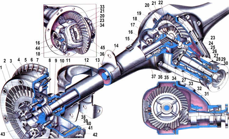 1. Болт крепления тормозного барабана колеса, 2. Направляющий штифт; 3. Маслоотражатель подшипника полуоси; 4. Тормозной барабан; 5. Чугунное кольцо тормозного барабана; 6. Колесный цилиндр заднего тормоза; 7. Штуцер для прокачки привода тормозного механизма; 8. Подшипник полуоси; 9. Запорное кольцо подшипника; 10. Фланец балки заднего моста: 11. Сальник полуоси; 12. Опорная чашка пружины подвески; 13. Балка заднего моста; 14. Кронштейн крапления верхней штанги подвески; 15. Направляющая полуоси; 16. Гайка подшипника дифференциала; 17. Подшипник коробки дифференциала; 18. Крышка подшипника коробки дифференциала; 19. Сапун; 20. Сателлит дифференциала; 21. Ведомая шестерня главной передачи; 22. Левая полуось; 23. Шестерня полуоси; 24. Картер редуктора заднего моста; 25. Регулировочное кольцо ведущей шестерни; 26. Распорная втулка подшипников; 27. Подшипник ведущей шестерни; 28. Сальник ведущей шестерни; 29. Грязеотражатель сальника; 30. Фланец-вилка карданного шарнира; 31. Гайка; 32. Маслоотражатель; 33. Ведущая шестерня главной передачи; 34. Ось сателлитов; 35. Опорная шайба шестерни полуоси; 36. Коробка дифференциала; 37. Правая полуось; 38. Кронштейны крепления деталей подвески; 39. Упорная пластина подшипника полуоси; 40. Щит заднего тормоза; 41. Колодка заднего тормозного механизма; 42. Фрикционная накладка: 43. Фланец полуоси; 44. Стопорная пластина; 45. Болт крепления крышки подшипника.