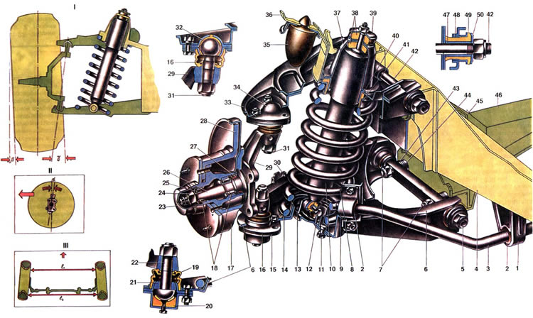 | Связывающим звеном между колесами и кузовом являются передняя и задняя подвески автомобиля. Через них передаются на кузов силы, действующие на колеса. Элементы, входящие в подвески, смягчают нагрузки, уменьшают колебания кузова, обеспечивают хорошую устойчивость и плавность хода автомобиля. К этим элементам относятся направляющее устройство, упругие элементы, амортизаторы и стабилизатор поперечной устойчивости. Направляющее устройство подвески определяет характер движения колеса относительно дороги и кузова и передает силы и моменты от колеса к кузову. К этому устройству относятся верхний 33 и нижний 6 рычаги подвески и шарнирно связанный с ними поворотный кулак 29. Верхний рычаг соединен осью 42 со стойкой передка кузова при помощи резинометаллических шарниров. Ось, выполненная в виде болта с шестигранной головкой, проходит через проушины рычага 33 и через втулку стойки передка кузова. В проушины верхнего рычага запрессованы резинометаллические шарниры, каждый из которых состоит из резиновой втулки 49, запрессованной между внутренней 47 и наружной 48 металлическими втулками с большим натягом. Наружная вгулка 48 запрессована в проушину верхнего рычага, а внутренняя 47 насажена на ось 42. Шарнир зажат на оси гайкой между полкой верхнего рычага и упорной шайбой 50. Качание верхнего рычага происходит в пределах деформации резиновой втулки 49. Резиновая втулка не должна проскальзывать относительно металлических втулок или шарнира на оси и в рычаге. Такая конструкция шарнира обеспечивает плотное соединение оси с рычагом подвески. К верхнему рычагу подвески тремя болтами крепится шаровая опора 34 неразъемной конструкции. В корпусе опоры расположен подшипник 32, основа которого - смола, а поверхность трения - тефлоновая ткань, плотно облегающая сферическую поверхность пальца 31. Детали шаровой опоры защищены от загрязнения резиновым армированным чехлом 19. Палец 31 установлен в коническое отверстие поворотного кулака 29 и закреплен самоконтрящейся гайкой. Нижний рычаг 6 подвешен на оси 5, которая двумя болтами 7 крепится к поперечине 46 подвески. Последняя крепится к лонжеронам кузова. Между осью и поперечиной установлены дистанционная 44 и регулировочные 43 шайбы. Изменением количества шайб 43 регулируют продольный угол (наклона оси поворота и угол развала) передних колес.' Резинометаллические шарниры нижнего рычага такой же конструкции, как и верхнего, отличаются только размерами и формой втулок. Снизу к рычагу подвески тремя болтами крепится нижняя шаровая опора. Ее конструкция отличается от верхней опоры. В корпусе опоры расположен палец 22 с полусферической головкой. На стержень пальца надет подшипник 21 с полусферической поверхностью. В нижнюю часть корпуса вставлен с натягом вкладыш 20, изготовленный из маслостойкой резины. На его поверхности, контактирующей с полусферой пальца 22, привулканизирован пластмассовый слой (смесь нейлона с сульфидом молибдена). За счет резинового вкладыша выбираются зазоры между деталями шаровой опоры, а подшипник 21 поджимается к полусферической поверхности верхней части корпуса опоры. Снизу в корпусе опоры имеется отверстие, через которое смазывается шарнир. Оно закрывается конической пробкой. Детали шаровой опоры защищены от загрязнения защитным чехлом 19. Нижняя шаровая опора соединена с по