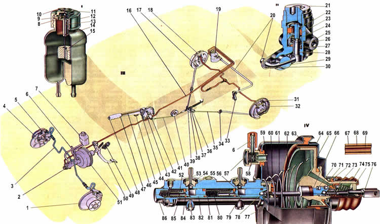 1. Диск тормоза. 2. Главный цилиндр гидропривода тормозов. 3. Трубопровод контура привода передних тормозов. 4. Защитный кожух переднего тормозного механизма. 5. Суппорт переднего тормоза. 6. Наконечник с трубопроводом. 7. Бачок главного цилиндра. 8. Неподвижный контакт. 9. Подвижный контакт. 10. Корпус клеммного устройства. 11. Толкатель для проверки исправности устройства контроля уровня жидкости. 12. Крышка бачка. 13. Корпус контактного устройства. 14. Отражатель. 15. Поплавок. 16. Трубопровод контура привода задних тормозов. 17. Фланец заднего наконечника оболочки троса. 18. Колесный цилиндр заднего тормоза. 19. Рогуля гор давления задних тормозов. 20. Рычаг привода регулятора давления. 21. Пробка корпуса регулятора давления. 22. Втулка. 23. уплотнитель головки поршня. 24. Тарелка пружины. 25. Корпус регулятора давления. 26. Пружина. 27. Уплатнительное кольцо поршня. 28. Поршень регулятора давления. 29. Ось рычага. 30. Пластина рычага. 31. Колодка тормозного механизма. 32. Рычаг ручного привода колодок. 33. Стойка рычага привода регулятора давления. 34. Кронштейн крепления оболочки троса. 35. Задний трос. 36. Контргайка. 37. Регулировочная гайка. 38. Втулка. 39. Направляющая заднего троса. 40. Направляющий ролик. 41. Передний трос. 42. Возвратный рычаг привода стояночного тормоза. 43. Кронштейн рычага привода стояночного тормоза. 44. Защелка рычага. 45. Упор включателя контрольной лампы стояночного тормоза. 46. Тяга защелки рычага. 47. Рычаг привода стояночного тормоза. 48. Кнопка рычага привода стояночного тормоза. 49. Выключатель стоп. сигнала. 50. Педаль тормоза. 51. Вакуумный усилитель. 52. Тарелка пружины уплотнительного кольца. 53. Штуцер. 54. Стопорная шайба. 55. Уплотнительная прокладка. 56. Распорное кольцо. 57. Корпус вакуумного клапана. 58. Вакуумный клапан. 59. Обойма уплотнителя штока. 60. Уплотнитель штока. 61. Шток. 62. Возвратная пружина корпуса клапана. 63. Диафрагма. 64. Крышка корпуса вакуумного усилителя. 65. Корпус клапана вакуумного усилителя. 66. Буфер штока. 67. Наружная оболочка шланга. 68. Нитяная оболочка. 69. Внутренняя оболочка. 70. Упорная пластина поршня. 71. Поршень клапана. 72. Уплотнитель крышки корпуса вакуумного усилителя. 73. Клапан вакуумного усилителя. 74. Защитный чехол корпуса клапана. 75. Воздушный фильтр. 76. Толкатель клапана вакуумного усилителя. 77. Возвратная пружина клапана. 78. Пружина клапана. 79. Корпус вакуумного усилителя. 80. Регулировочный болт. 81. Поршень привода передних тормозов. 82. Возвратная пружина поршня. 83. Упорная шайба. 84. Поршень привода задних тормозов. 85. Ограничительный винт поршня. 86. Уплотнительное кольцо. 87. Пружина уплотнительного кольца. 88. Пробка корпуса главного цилиндра. 89. I-Бачок главного цилиндра. 90. II-Регулятор давления. 91. III-Схема привода тормозов. 92. IV-Главный цилиндр и вакуумный усилитель.