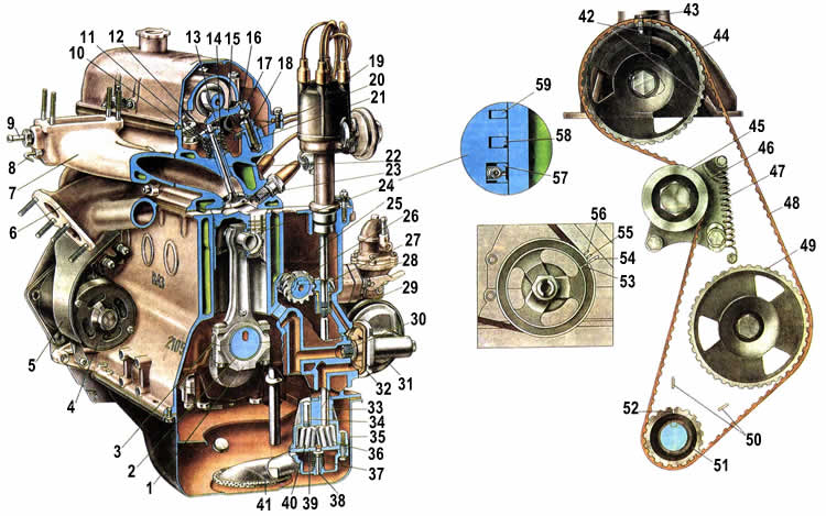 | Регулирование процессов впуска топливной смеси в цилиндры и выпуска из них отработавших газов в соответствии с принятым для двигателя порядком работы цилиндров и фазами газораспределения, осуществляется газораспрелелительным механизмом, который приводится в действие от ведущего шкива 51 коленчатого вала зубчатым ремнем 48- Этим же ремнем через шкив 49 приводится в действие масляный насос, распределитель зажигания и топливный насос. Ременная передача работает в сухой среде без смазки. Особенностью привода является применение ременной передачи с зубчатым ремнем. Ремень изготовлен из резины и для обеспечения высокой прочности армирован шнуром из стекловолокна, навитым по спирали. Зубья ремня имеют трапециевидную форму и для повышения износостойкости покрыты эластичной тканью. Резина, шнур и тканевая оболочка зубьев завулканизирована в единый прочный элемент, способный выдерживать нагрузку на разрыв до 10000 Н (1000 кгс). Натяжение ремня регулируется с помощью натяжного ролика 45, закрепленного на кронштейне 46. Степень натяжения ремня устанавливается пружиной 47 на неработающем двигателе при ослабленных болтах крепления кронштейна натяжного ролика. Снаружи ременная передача закрыта тремя пластмассовыми защитными крышками. В левой передней части блока цилиндров установлен валик 26 привода масляного насоса, распределителя зажигания и топливного насоса. Валик установлен вдоль двигателя и имеет две опорные шейки, винтовую шестерню и эксцентрик 25, который через толкатель приводит в действие топливный насос. В отверстия под подшипники валика запрессованы свертные сталоалюминиевые втулки 50 С 1984 г. задняя втулка изготавливается из металлокерамики. Совместной обработкой втулок в блоке обеспечивается необходимая соосность подшипников. Для прохода масла передняя втулка имеет отверстие, располагаемое против канала для смазки а блоке цилиндров. При проверке технического состояния блока и ремонта необходимо следить за совпадением смазочного отверстия в передней втулке с каналом в блоке цилиндров. Валик отлит из чугуна, поверхность эксцентрика закалена токами высокой частоты на глубину 2+0,5 мм. По оси валика имеется отверстие для подвода масла от его передней опоры к задней. Зазоры между втулками и опорными шейками валика привода масляного насоса и распределителя зажигания должны соответствовать для передней опоры 0,046-0,091 мм, для задней 0,0400,080 мм, предельно допустимый зазор для обеих опор 0.15 мм. Винтовая шестерня валика 26 находится в зацеплении с шестерней 27, которая приводит в действие распределитель зажигания и масляный насос. Шестерня 27 установлена вертикально и вращается в металлокерамической втулке, запрессованной в блок цилиндров. В шестерне выполнено отверстие со шлицами. в которое входят шлицевые концы валиков распределителя зажигания и масляного насоса. Корпус распределителя зажигания установлен на верхней плоскости блока цилиндров и крепится к нему стальной пластиной. Масляный насос крепится болтами к нижней плоскости блока цилиндров. Работа двигателя За один рабочий цикл в цилиндре двигателя происходит четыре такта впуск горючей смеси, сжатие, работный ход и выпуск отработавших газов. Эти такты осуществляются за два оборота коленчатого вала, т.е. каждый такт происходит за пол-оборота (180 ) коленчатого вала