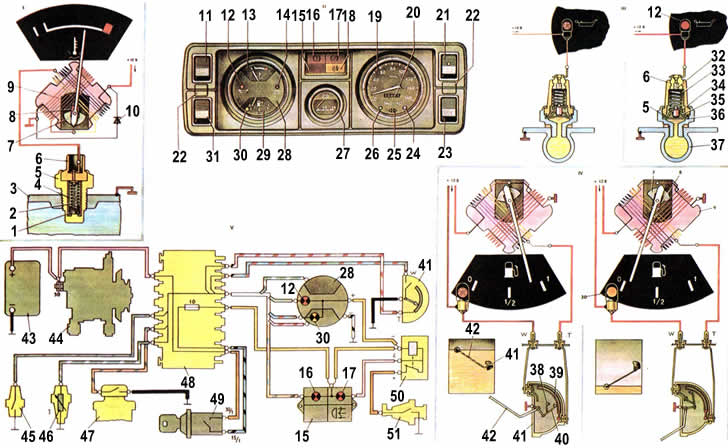 | На автомобилях ВАЗ-2105 и ВАЗ-2104 все контрольные приборы расположены на щитке приборов. На нем находятся: спидометр 19, вольтметр 2?, блок 15 контрольных ламп, комбинация приборов 28, а также четыре выключателя. Щиток приборов крепится к панели приборов с помощью двух винтов, закрытых заглушками 22. Чтобы снять щиток для замены перегоревших ламп или поврежденных приборов, необходимо снять отверткой заглушки 22. отвернуть винты и аккуратно вынуть щиток приборов из гнезда панели приборов. При установке щитка на место надо не допускать резких перегибов гибкого вала привода спидометра. приводящих к остаточной деформации оболочки вала. Радиусы изгиба вала в смонтированном состоянии должны быть не менее 100 мм. Комбинация приборов применяется типа 12.3801. Она состоит из двух приборов указателя 13 температуры охлаждающей жидкости и указателя 29 уровня топлива. Кроме того, в ней имеется три контрольные лампы: 30 - резерва топлива, 12 - недостаточного давления масла и 14 - заряда аккумуляторной батареи. Комбинация приборов крепится к щитку с помощью двух скоб и гаек. Корпус комбинации приборов пластмассовый. Спереди к нему, крепится наружный ободок со стеклом, а сзади закреплена печатная плата из фольгированного стеклотекстолита, на которой установлены механизмы указателей, а также диод 10 защиты приборов. Диод подключен между проводником "+" и "массой". Через него замыкаются на массу импульсы обратных токов, что предохраняет от размагничивания постоянные магниты указателей. Чтобы исключить взаимное влияние магнитных полей указателей, между ними находятся стальные экраны. Характерной особенностью комбияации приборов и спидометра является коническая форма защитного стекла шкал. Такая форма позволяет устранить блики, мешающие считывать показания приборов. Чтобы не повредить стекло, нельзя очищать его с помощью растворителей Существует две разновидности комбинации приборов, различающиеся схемой включения контрольной лампы заряда аккумуляторной батареи. До 1988 г., когда применялся генератор Г-222, один вывод лампы соединялся с "массой". а второй со штекером "87" контрольной лампы заряда, если оно имелось на автомобиле. С 1988 г., когда стал устанавливаться генератор 37.3701, один вывод лампы стал соединяться с "плюсом" питания, а второй с выводом "61" генератора. Спидометр. На автомобилях ВАЗ-2105 и ВАЗ-2104 применяется спидометр типа 17.3802. Он крепится к щитку приборов с помощью двух скоб и гаек. Спидометр имеет стрелочный указатель скорости автомобиля и счетчик пройденного пути. Механизмы спидометра приводятся в действие гибким валом от привода, установленного на задней крышке коробки передач. Один оборот гибкого вала соответствует 1 м пройденного пути. В нижней части спидометра расположены три информационные контрольные лампы 24, 25 и 26 типа АМН12-3, которые извещают водителя о включении дальнего света фар, указателей поворота и наружного освещения. Гнезда ламп закрыты цветными светофильтрами. Механизм указателя скорости спидометра состоит из постоянного магнита, установленного на приводном валике и алюминиевой картушки (в виде стаканчика), закрепленной на оси вместе со стрелкой. При вращении магнита магнитные силовые линии пронизывают картушку и индуктируют в ней ЭДС. под действием которой в карушке возникают вихревые токи. Эти токи создают собственное ма