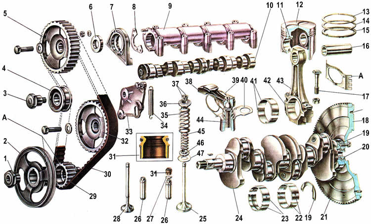 1. Гайка крепления шкивов. 2. Шкив привода генератора и насоса охлаждающей жидкости. 3. Ось натяжного ролика. 4. Натяжной ролик. 5. Шкив распределительного вала . 6. Сальник распредепительного вала. 7. Держатель сальника. 8. Упорный фланец распределительного вала. 9. Корпус подшипников распределительного вала. 10. Распределительный вал. 11. Терморегулирующая пластина поршня. 12. Поршень. 13. Верхнее компрессионное кольцо. 14. Нижнее компрессионное кольцо. 15. Маслосъемное кольцо. 16. Палец поршня. 17. Болт крепления крышки шатуна. 18. Маховик. 19. Упорное полукольцо коленчатого вала. 20. Передний подшипник первичного вала коробки передач. 21. Зубчатый обод маховика. 22. Вкладыши З-го (центрального) коренного подшипника коленчатого вала. 23. Вкладыши 1. 2. 4 и 5-го коренных подшипников коленчатого вала. 24. Коленчатый вал. 25. Впускной клапан. 26. Направляющая втулка клапана . 27. Стопорное кольцо. 28. Выпускной клапан. 29. Зубчатый шкив коленчатого вала. 30. Зубчатый ремень. 31. Маслоотражательный колпачок. 32. Шкив привода масляного насоса, распределителя зажигания и топливного насоса. 33. Кронштейн натяжного ролика. 34. Пружина натяжного ролика . 35. Наружная пружина клапана. 36. Тарелка пружин. 37. Сухари клапана. 38. Рычаг привода клапана. 39. Пружина рычага. 40. Стопорная пластина пружины рычага. 41. Вкладыш и шатуна. 42. Крышка шатуна. 43. Шатун. 44. Регулировочный болт клапана. 45. Внутренняя пружина клапана. 46. Опорная шайба внутренней пружины. 47. Опорная шайба наружной пружины. 48. Метки в.м.т. поршней I и 4-го цилиндров.