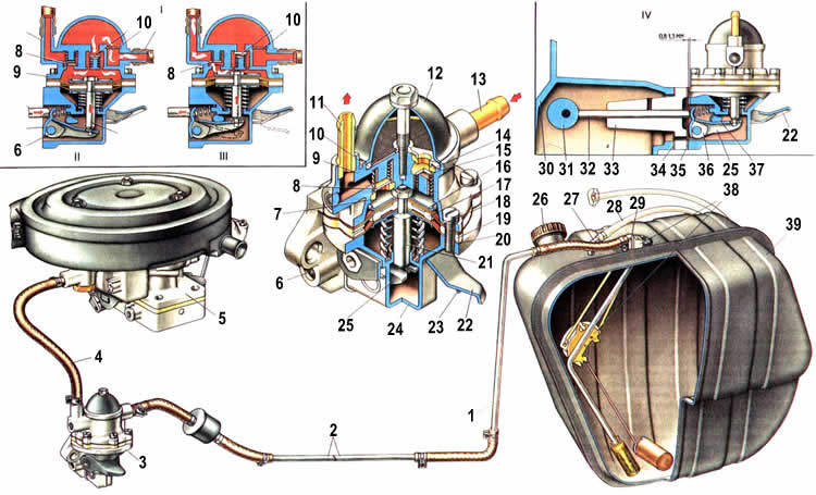 1. Задняя трубка топливного трубопровода; 2. Передняя трубка топливного трубопровода; 3. Топливный насос; 4. Шланг от топливного насоса к карбюратору; 5. Карбюратор; 6. Ось рычага механической подачи топлива; 7. Седло нагнетательного клапана; 8. Нагнетательный клапан; 9. Верхний корпус насоса; 10. Фильтр; 11. Нагнетательный патрубок; 12. Крышка насоса; 13. Всасывающий патрубок; 14. Седло всасывающего клапана; 15. Всасывающий клапан; 16. Тарелка диафрагмы; 17. Внутренняя дистанционная прокладка; 18. Верхние диафрагмы; 19. Наружная дистанционная прокладка; 20. Нижняя диафрагма: 21. Шток; 22. Рычаг ручной подкачки топлива; 23. Пружина рычага; 24. Нижний корпус насоса; 25. Балансир; 26. Пробка топливного бака; 27. Воздушная трубка топливного бака; 28. Шланг сообщения топливного бака с атмосферой; 29. Приемная труба; 30. Блок цилиндров; 31. Эксцентрик валика привода масляного насоса и распределителя зажигания; 32. Толкатель; 33. Теплоизоляционная проставка топливного насоса; 34. Прокладка теплоизоляционной проставки; 35. Прокладка топливного насоса; 36. Рычаг механического привода насоса; 37. Кулачок; 38. Датчик указателя уровня топлива; 39. Топливный бак; 40. I. Схема работы топливного насоса; 41. II.Схема установки топливного насоса.
