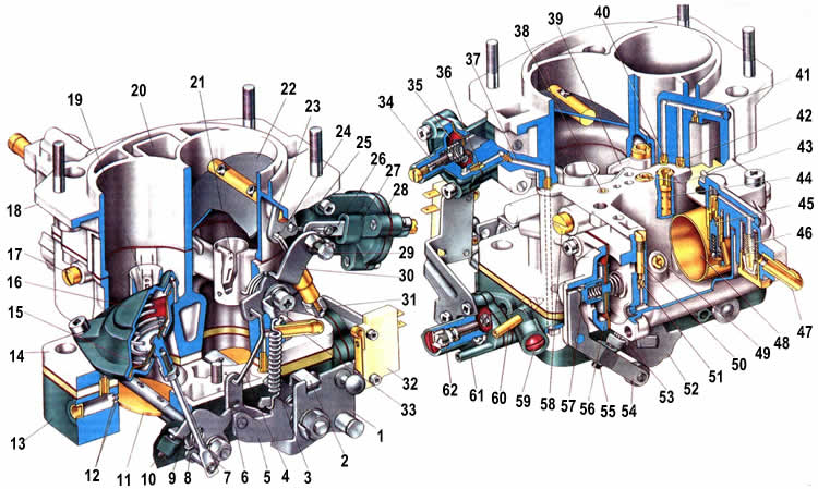 1. Рычаг привода дроссельных заслонок; 2. Рычаг управления дроссельными заслонками; 3. Возвратная пружина; 4. Тяга соединений приводов воздушной и дроссельной заслонок; 5. Рычаг, ограничивающий открытие дроссельной заслонки второй камеры; 6. Рычаг связи с воздушной заслонкой; 7. Шток пневмопривода; 8. Рычаг, связанный с рычагом 9 через пружину; 9. Рычаг, жестко закрепленный на оси дроссельной заслонки второй камеры; 10. Винт, ограничивающий закрытие дроссельной заслонки второй камеры; 11. Дроссельная заслонка второй камеры; 12. Отверстия переходной системы второй камеры: 13. Корпус дроссельных заслонок; 14. Корпус карбюратора; 15. Диафрагма пненмопривода: 16. Пневмопривод дроссельной заслонки второй камеры; 17. Корпус топливного жиклера переходной системы второй камеры; 18. Крышка карбюратора; 19. Малый диффузор второй камеры; 20. Колодец главных воздушных жиклеров главных дозирующих систем; 21. Распылитель главной дозирующей системы первой камеры; 22. Воздушная заслонка; 23. Рычаг оси воздушной заслонки; 24. Телескопическая тяга привода воздушной заслонки; 25. Тяга, соединяющая рычаг оси воздушной заслонки с рейкой; 26. Шток пускового устройства; 27. Корпус пускового устройства; 28. Крышка пускового устройства; 29. Винт крепления троса привода воздушной заслонки; 30. Трехплечий рычаг: 31. Кронштейн возвратной пружины; 32. Микропереключатель; 33. Патрубок для отсоса картерных газов; 34. Регулулировочный винт пускового устройства; 35. Диафрагма пускового устройства; 36. Воздушный жиклер пускового устройства: 37. Канал связи пускового устройства с задроссельным пространством; 38. Воздушный жиклер системы холостoго хода; 39. Распылитель ускорительного насоса; 40. Эмульсионный жиклер обогатительной системы (эконостат); 41. Воздушный жиклер эконостата; 42. Топливный жиклер эконостата: 43. Главные воздушные жиклеры; 44. Эмульсионная трубка второй камеры; 45. Игольчатый клапан поплавковой камеры; 46. Топливный жиклер; 47. Патрубок подвода топлива к карбюратору; 48. Поплавок; 49. Главный топливный жиклер первой камеры; 50. Винт регулировки подачи топлива ускорительным насосом; 51. Перепускной жиклер ускорительного насоса; 52. Кулачок привода ускорительного насоса; 53. Возвратная пружина дроссельной заслонки первой камеры 54. Рычаг привода ускорительного насоса; 55. Винт, ограничивающий закрытие дроссельной заслонки первой камеры: 56. Диафрагма ускорительного насоса; 57. Колпачок пружины; 58. Корпус топливного жиклера системы холостого хода; 59. Регулировочный винт состава (качества) смеси холостого хода ; 60. Патрубок для подачи разрежения к вакуумному регулятору распределения зажигания ; 61. Патрубок для подвода разрежения от пневмоклапана; 62. Регулировочный винт количества смеси холостого хода.