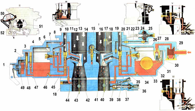 | Работа карбюратора при пуске и прогреве холодного двигателя. Для надежного запуска холодного двигателя требуется сильное обогащение горючей смеси, так как при низких температурах и малых скоростях воздуха, проходящего через карбюратор, происходит некачественное смесеобразование. Обогащение смеси обеспечивается пусковым устройством карбюратора. При пуске холодного двигателя рукоятку управления пусковым устройством вытягивают на себя до упора. Педаль управления дроссельными заслонками трогать нельзя во избежание подачи в двигатель неконтролируемой избыточной порции топлива. При этом под воздействием тяги рычаг 36 (см. рис. 9) поворачивается против часовой стрелки, телескопическая тяга 24 через рычаг 23 закрывает воздушную заслонку 22. Конец тяги 25, перемещаясь в прорези штока 26 диафрагмы пускового устройства, займет крайнее левое положение, а тяга 4, опускаясь вниз, повернет рычаг 6. который, воздействуя на пор рычага 1, приоткроет дроссельную заслонку первой камеры на необходимую величину. При провертывании коленчатого вала стартером возникающее при этом разрежение передается в отверстия и каналы системы холостого хода, а через приоткрытую дроссельную заслонку первой камеры к распылителю главной дозирующей системы. Под воздействием разрежения топливо начинает интенсивно истекать из отверстий системы холостого хода и распылителя главной дозирующей системы первой камеры. Одновременно разрежение создается в рабочей полости диафрагмы 35, но оно недостаточно для того, чтобы преодолеть сопротивление возвратной пружины. В момент появления вспышек разрежение возрастает, под действием которого диафрагма 35 со штоком 26 втягиваются и тяга 25 за рычаг 23 приоткрывает воздушную заслонку 22. При этом рычаг 23 поворачивается и сжимает пружину, имеющуюся внутри телескопической тяги 24. Крайнее втянутое положение диафрагмы 35 ограничивается регулировочным винтом 34. При регулировании винтом 34 следует руководствоваться тем, что при вытянутой полностью рукоятке пускового устройства и воздействии на тягу 25 вручную воздушная заслонка должна приоткрываться на величину пускового зазора (зазор между нижней кромкой и стенкой входной горловины). Воздушная заслонка при пуске и начале прогрева двигателя приоткрывается или закрывается автоматически, не допуская чрезмерного обогащения или обеднения смеси. по мере прогрева двигателя воздушную заслонку полностью открывают возвратом рукоятки управления пусковым устройством в исходное положение. Пусковое устройство обеспечивает надежный запуск двигателя до температур -25 С без предварительной подготовки. Работа карбюратора на холостом ходу. На режиме холостого хода дроссельная заслонка 40 (см. рис. 10) прикрыта, при этом переходные отверстия системы холостого хода находятся над верхней кромкой заслонки. Воздушная заслонка открыта полностью. Разрежение через отверстие, прикрытое иглой 37 экономайзера принудительного холостого хода, передается в каналы системы холостого хода. Под действием разрежения топливо, поступающее в эмульсионный колодец через главный топливный жиклер 34, поднимается к топливному жиклеру 33, частично смешивается с воздухом, поступающим через воздушный жиклер 26, вторично смешивается с воз Лучом, поступающим через переходные отверстия, и через отверстие, регулируе