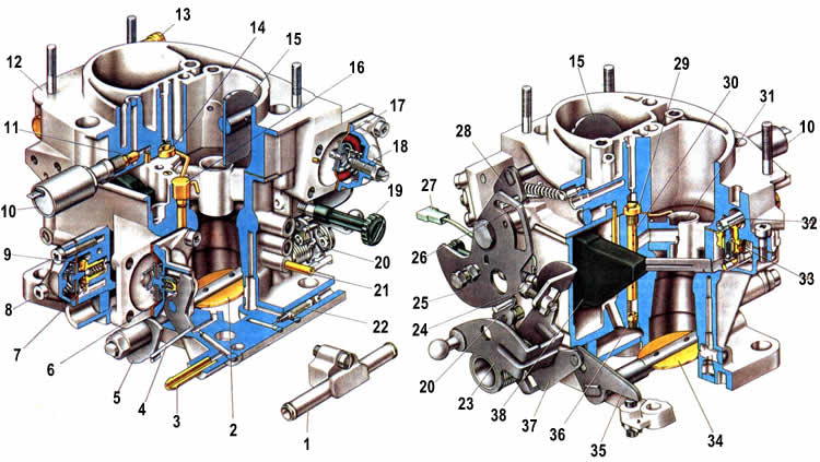 | На автомобилях ВАЗ-21065 устанавливается карбюратор модели 21053-1107010. Тарировочные данные карбюратора приведены в таблице. Карбюратор имеет сбалансированную поплавковую камеру, систему отсоса картерных газов за дроссельную заслонку, блокировку второй камеры. В карбюраторе имеются две главные дозирующие системы первой и второй камер, система холостого хода первой камеры с переходной системой, переходная система второй камеры, экономайзер принудительного холостого хода, экономайзер мощностных режимов, диафрагменный ускорительный насос с механическим приводом и диафрагменное пусковое устройство. Карбюратор состоит из двух корпусных деталей: корпуса 8 и крышки 12 карбюратора. Во входной горловине первой камеры установлена воздушная заслонка 15 пускового устройства. На оси воздушной заслонки жестко установлен рычаг 28 с двумя штифтами, на один из которых надета возвратная пружина. Второй штифт входит в фигурный паз рычага 25 управления воздушной заслонкой. На наружную кромку рычага 25 опираются регулировочный винт 24 приоткрывания дроссельной заслонки первой камеры и штифт рычага 20 блокировки второй камеры. В крышке 12 карбюратора установлены игольчатый запорный клапан 33 подачи топлива, поплавок 38, топливный фильтр 32, патрубок 13 подачи топлива в поплавковую камеру. К приливу крышки 12 крепится крышка пускового устройства с диафрагмой 17 в сборе со штоком 26. В крышку завернут электромагнитный запорный клапан 10 с топливным жиклером холостого хода. В корпусе 8 карбюратора отлиты большие диффузоры и установлены малые легкосъемные диффузоры, отлитые заодно с распылителями главных дозирующих систем. В корпусе 8 установлены распылители 16 ускорительного насоса с шариковым клапаном, главные воздушные жиклеры 14 и 29 с эмульсионными трубками 30 в эмульсионных колодцах, заборная трубка переходной системы с топливным жиклером. В эмульсионные колодцы завернуты главные топливные жиклеры 36. В приливы корпуса карбюратора устанавливаются регулировочный винт полноты закрытия дроссельной заслонки 34 второй камеры, а также регулировочный винт 19 количества смеси холостого хода с электроприводом 27 конечного выключателя экономайзера принудительного холостого хода. В корпус завернут регулировочный винт 22 качества смеси холостого хода. К приливу корпуса 8, образующему рабочую полость ускорительного насоса, четырьмя винтами крепится крышка ускорительного насоса с рычагом 4 привода в сборе с диафрагмой 6 насоса. К корпусу крепится также винтами крышка экономайзера мощностных режимов с рабочей диафрагмой 9. На диафрагму воздействует пружина. В корпус карбюратора под диафрагмой 9 установлены топливный жиклер 7 и клапан экономайзера мощностных режимов. В нижней части корпуса 8 установлены на осях дроссельные заслонки 2 и 34. На оси дроссельной заслонки первой камеры установлены: рычаг 23 привода дроссельных заслонок с регулировочным винтом 24 приоткрывания заслонки и с рычагом 20 блокировки второй камеры; рычаг 37 привода дроссельной заслонки второй камеры; возвратная пружина и кулачок 5 ускорительного насоса. На оси дроссельной заслонки второй камеры установлен рычаг 35 дроссельной заслонки. Блокировка второй камеры не допускает открывания дроссельной заслонки второй камеры на любом режиме работы двигателя, если полностью не открыта воздушная