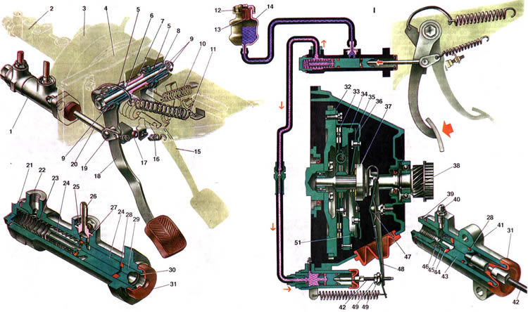 | Педали сцепления и тормоза подвешены к кронштейну 4 на одной оси 8, выполненной в виде болта. Под его головку установлена упорная шайба, а на его конец навертывается гайка с пружинной шайбой. В ступицах педалей установлены наружные пластмассовые втулки 9. Поворот педалей происходит на внутренних металлических втулках 5, надетых на ось. Между педалью тормоза и щекой кронштейна установлена дистанционная пластмассовая втулка 7. Педаль сцепления шарнирно соединена с толкателем 20 и пластиной 19 оттяжной пружины. Они удерживаются на пальце шплинтом. Оттяжная пружина 16 удерживает педаль сцепления в исходном положении, при котором педаль упирается в колпачок ограничителя 17 хода педали. Другой конец толкателя входит в гнездо поршня 29 главного цилиндра. Ограничителем хода педали регулируют зазор между полусферическим концом толкателя и поршнем 29. К верхнему концу педали приварен кронштейн, в вырез которого заходит крючок 6; другой конец крючка соединен с сервопружиной И. Сервопружина стремится повернуть верхнюю часть педали в сторону выключения сцепления, чем значительно снижает усилие, прикладываемое к педали сцепления. Главный цилиндр 1 привода выключения сцепления крепится на двух шпильках к торцевой пластине кронштейна педалей. К этой же пластине крепятся вакуумный усилитель 3 с главным цилиндром 2 привода тормозов. В полости главного цилиндра установлены два поршня 24 и 29 и возвратная пружина 23. Она упирается одним концом в пробку 21, другим - в буртик поршня 24 и служит для возвращения поршней в исходное положение. За счет установки двух поршней уменьшаются радиальные нагрузки на поршень 24 при воздействии толкателя 20 на поршень 29, а также улучшается уплотнение поршней, так как между ними сжимается уплотнительное кольцо 28. Поршень главного цилиндра уплотнен резиновым кольцом, которое расположено в канавке поршня и создает герметичность в рабочей полости цилиндра. Чтобы по мере возрастания давления в рабочей полости одновременно улучшалось уплотнение поршня, в его хвостовике выполнен осевой канал, соединяющийся с радиальными отверстиями, которые выходят в канавку уплотнительного кольца. Когда давление в рабочей полости цилиндра возрастает, то по/- его воздействием уплотнительное кольцо распирается по радиусу, т. е. плотнее прилегает к зеркалу цилиндра. Одновременно уплотнительное кольцо является клапаном, через который полость цилиндра сообщается с бачком 14. Это происходит при крайнем заднем положении "поршней, когда уплотнительное кольцо н6 перекрывает компенсационное отверстие в корпусе цилиндра. Все детали удерживаются в полости цилиндра стопорным кольцом 30. Защитный колпачок 31 предохраняет полость цилиндра от загрязнения. В отверстиях корпуса цилиндра закреплены трубопровод, отводящий жидкость от главного цилиндра к рабочему, и штуцер 26, соединенный шлангом с бачком гидропривода. Штуцер 26 в гнезде корпуса уплотнен резиновой прокладкой 27 и крепится стопорной шайбой 25. Рабочий цилиндр 32 (см. рис. 13) привода выключения сцепления крепится двумя болтами к картеру 13 сцепления. Верхний болт одновременно крепит пластину оттяжной пружины 33, которая возвращает в исходное положение вилку выключения сцепления. В корпусе цилиндра расположен поршень 43 (см. рис. 14) с двумя уплотнительными кольцами. Заднее кольцо 28 установле
