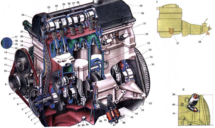 | На автомобилях ВАЗ-2107. -21072. -21074 установлены четырехцилиндровые, четырехтактные карбюраторные двигатели 2103, 2105 и 2106 с различным объемом цилиндров (см. "Техническая характеристика автомобилей")- Двигатель 2105. имеющим ременный привод распределительного вала, применяется только на автомобилях ВАЗ-21072, которых выпускается незначительное количество. Поэтому в данном альбоме он не описывается, а с его устройством можно ознакомиться по альбому "Автомобили ЬАЗ-2105. ВАЗ2104". Двигатели 2103 и 2106, которые описываются ниже, отличаются друг от друга блоком цилиндров и поршнями с поршневыми кольцами. Компоновка двигателей отличается простотой и удобством обслуживания. Все узлы двигателя, требующие регулировки и ухода (распределитель зажигания, свечи, карбюратор, воздушный фильтр, регулировочные винты рычагов привода клапанов, гайка натяжителя цепи, масляный фильтр, генератор), установлены в легкодоступных местах. Нумерация цилиндров ведется от шкива привода генератора и водяного насоса. С левой стороны головки цилиндров около нижней ее плоскости отлит номер каждого цилиндра, а также порядок работы цилиндров (1-3-4-2). Цилиндры двигателя объединены вместе с верхней частью картера и представляют собой единую отливку - блок цилиндров. При такой компоновке обеспечивается прочность конструкции, жесткость, компактность, надежность и уменьшается масса двигателя. В нижней части блока цилиндров на пяти опорах установлен коленчатый вал. Передний и задний концы коленчатого вала уплотняются самоподжимными резиновыми сальниками. В каждом цилиндре двигателя имеется по одному впускному и одному выпускному клапану. Поршни 15 имеют по два компрессионных кольца 16 и 17 и одно маслосъемное 14 с пружиной. Соединен поршень с шатуном поршневым пальцем 33, запрессованным в верхнюю головку шатуна. Распределительный вал 27 установлен на головке цилиндров в корпусе 26 и приводится во вращение от коленчатого вала двухрядной роликовой цепью 20. Достоинством привода являются простота конструкции и меньшая масса по сравнению с другими видами передач. Блок цилиндров 18 является базовой деталью двигателя и служит для установки и крепления механизмов, аппаратов и вспомогательных агрегатов двигателя. Блок отлит из специального низколегированного чугуна. Протоки для охлаждения двигателя сделаны по всей высоте цилиндров, что улучшает охлаждение поршней и поршневых колец и уменьшает деформации блока от неравномерного нагрева. Для повышения жесткости нижняя плоскость опущена на 50 мм ниже оси коленчатого вала. Цилиндры блока по диаметру подразделяются на пять классов через 0,01 мм, обозначаемых буквами А. В, С, D, Е: Диаметр цилиндра двигателя 2103, мм 76.00076.010 76.010-76,020 76,020-76,030 76.030-76.040 76.040-76.050 Диаметр цилиндра двигателя 2106 и 2105, мм 79,000-79,010 79,010-79,020 79,020-79, 030 79.030-79.040 79.040-79.050 Класс цилиндра указан на нижней плоскости блока против каждого цилиндра. Цилиндр и сопрягающий с Нил поршень должны иметь одинаковый класс. При ремонта цилиндры могут быть расточены и хонингованы под увеличенный диаметр поршней (на 0.4-0,8 мм) с учетом обеспечения зазора между поршнем и цилиндром 0,05-0,07 мм Для обеспечения ремонта кривошипно-шатунного механизма выпускаются детали ремонтных размеров поршни и поршневые кольца, увеличенные по диаметр) на 0,4 и 0,8 мм; вкладыши коренных и шатунных подшил инков для шеек коленч
