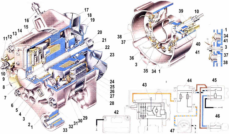 | Генератор служит для питания потребителей электрическим током и для зарядки аккумуляторной батареи. До 1588 г. применялся только генератор r-222. С 1988 г. на части автомобилей может быть установлен генератор 37.3701 (с автомобилей ВАЗ-2108). Устройство его такое же, как и генератора Г-222, а отличается он только данными обмоток ротора и статора, регулятором напряжения и выпрямительным блоком. Генератор представляет собой трехфазную синхронную электрическую машину с электромагнитным возбуждением. Для преобразования переменного тока в постоянный в генератор встроен выпрямитель на шести кремниевых диодах. Генератор установлен на двигателе с правой стороны и приводится во вращение клинаременной передачей от шкива коленчатого вала. Через отверстия в ушках крышек 1 и 23 генератор крепится болтом к литому чугунному кронштейну на двигателе и шпилькой к натяжной планке, чтобы при затяжке болта не обломились ушки крышек, в отверстии ушка крышки 1 имеется резиновая буферная втулка З*. Под действием усилия затяжки болта поджимная втулка 33 смещается, выбирая зазор между ушком и кронштейном генератора, буферная втулка 32 сжимается между стальными втулками и поэтому усилие затяжки не передается на ушко. Основные части генератора - это ротор, статор 27 и крышки 1 и 23. отлитые из алюминиевого сплава. Ротор состоит из вала 8, на рифленую поверхность которого напрессованы стальные клювообразные полюса 18 и 30, образующие вместе с валом сердечник электромагнита. Между клювообразными полюсами в пластмассовом каркасе помещена обмотка 25 возбуждения ротора. Концы обмотки выведены через отверстия в полюсе 30 и припаяны к выводам контактных колец 4 и 5. Контактные кольца установлены на пластмассовой втулке, имеющей стальную ступицу. Ротор вращается в двух шариковых подшипниках закрытого типа, (замазка закладывается в подшипники при их изготовлении и пополнения при эксплуатации не требует. Внутренняя обойма переднего подшипника 22 свободно посажена на вал ротора и вместе с дистанционным кольцом 21 зажата между ступицей шкива и буртиком вала гайкой крепления шкива. Наружная обойма подшипника 22 запрессована в крышку и зажата между двумя шайбами, стянутыми четырьмя винтами. Внутренняя обойма заднего подшипника 6 напрессована на вал ротора. Наружная обойма поджимается резиновым кольцом. На валу ротора на сегментной шпонке установлены шкив 19 с вентилятором, изготовленные из листовой стали и соединенные электросваркой. Вентилятор служит для охлаждения выпрямителя и внутренних частей генератора. Воздух входит в окна крышки 1, проходит между статором и ротором и через окна крышки 53 крыльчаткой вентилятора выбрасывается наружу. Статор набран из пластин электротехнической стали, соединенных электросваркой. На внутренней стороне статора имеется 36 пазов полузакрытой формы, изолированные лаком или электроизоляционным картоном. В пазы уложена трехфазная обмотка, закрепленная от выпадания деревянными клиньями или пластмассовыми трубками. Каждая фазная обмотка состоит из шести катушек. Фазные обмотки соединены в звезду с выводом (штекер 11) нулевой точки. На задней крышке 1 генератора винтами закреплен регулятор 13 напряжения и щеткодержатель 14 со щетками 9 и 15. Через щетки, прижатые пружинами к контактным кольцам ротора, подводится ток к обмотке возбуждения. Одна 