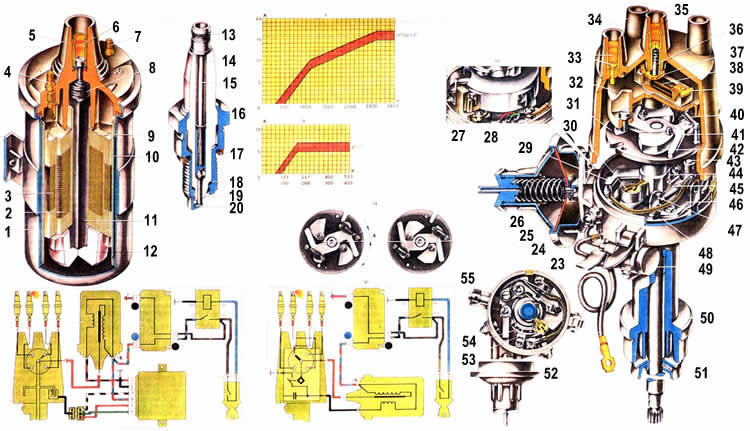 | До 1989 г. на автомобилях ВАЗ-2107 применялась только контактная система зажигания. С 1989 г. на части автомобилей может быть установлена бесконтактная электронная система зажигания высокой энергии. У нее вместо прерывателя (с контактами) для размыкания цепи низкого напряжения применяется электронный коммутатор, который размыкает и замыкает цепь за счет запирания или отпирания выходного транзистора (т.е. без контактов). Такая система позволяет повысить напряжение на электродах свечей и тем самым увеличить энергию искрового разряда. Кроме того, уровень напряжения на свечах зажигания не снижается при малой частоте вращения двигателя и поэтому улучшаются условия пуска двигателя. Распределитель зажигания применяется в классической (контактной сети и служит для прерывания тока в цепи низкого напряжения катушки зажигания и распределения импульсов высокого напряжения по свечам зажигания. На автомобилях ВАЗ-2107 и ВАЗ-21074 применяется распределитель зажигания 30.3706, а на ВАЗ-21072 - типа 30.3706-01. Первый распределитель зажигания отличается от второго только длиной валика 21 и для отличия на конце валика около шлицев имеет кольцевую канавку. Основные части распределителя зажигания: прерыватель, центробежный и вакуумный регуляторы опережения зажигания и распределитель. Прерыватель состоит из кулачка 44 с четырьмя выступами и стоики 46 с контактами, которые кулачок размыкают при вращении. Кулачок смазывается войлочным фильцем 30, пропитанным маслом. К стойке приклепана ось, на которой на текстолитовой втулке установлен рычажок 45 с контактом, прижатым пластинчатой пружиной к контакту стойки. К верхнему концу втулки кулачка припаяна опорная пластина 31 центробежного регулятора опережения зажигания. К пластине приклепаны оси металлокерамических грузиков 42 и стойки пружин 40. Другим концом пружины крепятся к стойкам, приклепанным к пластине 41 центробежного регулятора. При работе двигателя под действием центробежных сил грузики расходятся, упираются в пластину 4* и, преодолевая сопротивление пружин, поворачивают пластину 31 (а следовательно и кулачок 44) по часовой стрелке относительно валика распределителя зажигания. Вакуумный регулятор опережения зажигания состоит из корпуса 24 с крышкой 26, между которыми зажата гибкая диафрагма 25. С одной стороны к диафрагме крепится тяга 29, а с другой - находится пружина. отжимающая диафрагму с тягой в направлении вращения кулачка 44. Под действием разрежения диафрагма изгибается и через тягу поворачивает пластину с контактами прерывателя против часовой стрелки. Распределитель состоит из ротора 32 и электродов, установленных в пластмассовой крышке 34. На роторе приклепаны центральный 37 и наружный 39 контакты ротора, между которыми в специальном углублении находится резистор 38 для подавления радиопомех. В центральный контакт ротора опирается под- пружиненный угольный электрод 36, передающий импульсы высокого напряжения от катушки зажигания к ротору. При вращении ротора эти импульсы передаются от наружного контакта-39 к боковым электродам 33, залитым в крышке и далее к свечам зажигания Датчик-распределитель зажигания. В бесконтактной системе зажигания применяется датчик-распределитель зажигания 38.3706 (для ВАЗ-2107 и ВАЗ-21074) или 381.3706 (для ВАЗ-21072). Они различаются только длиной валика, и на хвостовике валика да