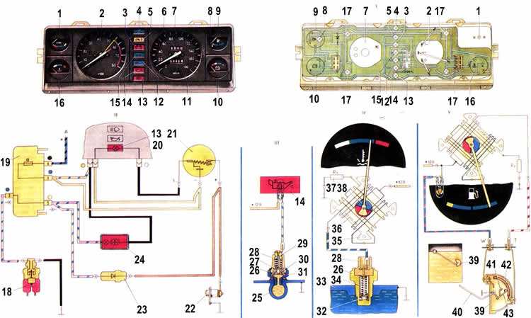 | Комбинация приборов. Все контрольные приборы и большинство контрольных ламп объединены в единый узел - комбинацию приборов. Она устанавливается в гнезде панели приборов и крепится двумя винтами. До 1988 г. устанавливалась комбинация приборов типа 15.3701, а с 1988 г. устанавливается типа 151.3801. Последняя отличается от первой схемой соединений, введением эконометра вместо указателя давления масла и в связи с этим перемещением контрольной лампы давления масла в среднюю часть комбинации приборов. Кроме того, добавлена контрольная лампа воздушной заслонки карбюратора, а две контрольные лампы (противотуманного света и уровня тормозной жидкости) перенесены из комбинации приборов в отдельные табло. Корпус комбинации приборов пластмассовый, с отсеком в средней части для контрольных ламп. На задней стенке корпуса имеется четыре зеленых светофильтра с лампами 17 освещения приборов. Снаружи к корпусу винтами прикреплена черная пластмассовая рамка с приклеенным стеклом. Стекло выполнено вогнутым, что устраняет блики, мешающие считывать показания приборов. Электрические соединения между приборами, контрольными лампами и выводными штекерами выполнены методом печатного монтажа на плате из фольгированного гетинакса. Печатная плата вместе с колодками штекеров приклепана к задней стенке корпуса. Печатная плата служит одновременно и для крепления контрольных ламп и ламп освещения приборов. Лампы вставляются в пластмассовые патроны, а те - в отверстия печатной платы. Спидометр типа 23.3802 имеет стрелочный указатель скорости и два счетчика: суммирующий 11 и суточный 6 пройденного пути, показания которого можно устанавливать на нуль рукояткой, расположенной под панелью приборов. Для этого рукоятку необходимо вращать против часовой стрелки. Чтобы не повредить счетчик, это следует делать на неподвижном автомобиле. Механизмы спидометра приводятся в действие гибким валом от привода, установленного на картере сцепления. Один оборот гибкого вала соответствует 1 м пройденного пути. Эконометр 18.3806, установленный в комбинации приборов, служит для ориентировочного определения расхода топлива на данном режиме работы двигателя. Это прибор механического типа. Он представляет собой вакуумметр, измеряющий разрежение во впускном трубопроводе двигателя, с которым непосредственно связан расход топлива. Чем меньше приоткрыты дроссельные заслонки в карбюраторе. тем больше разрежение во впускном трубопроводе, а расход топлива меньше. И наоборот, при больших нагрузках на двигатель дроссельные заслонки открываются почти полностью, разрежение падает (стрелка эконометра переходит в красную зону шкалы), а расход топлива увеличивается. Таким образом, эконометр помогает водителю соблюдать наиболее экономичный режим движения автомобиля подбором передачи в коробке передач и частоты вращения коленчатого вала. Тахометр. В комбинации приборов устанавливается электронный тахометр типа 20.3813. Он состоит из миллиамперметра и электронной части, смонтированной на печатной плате. Принцип действия тахометра основан на измерении частоты следования импульсов в первичной цепи системы зажигания двигателя. На работающем двигателе за один оборот валика распределителя зажигания контакты прерывателя размыкаются и замыкаются четыре раза. Следовательно, за один обор