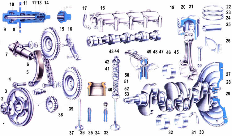 | Энергия расширения продуктов сгорания топлива через кривошипно-шатунный механизм двигателя передается на коленчатый вал двигателя. Детали кривошипно-шатунного механизма при этом подвергаются воздействию значительных механических и термических нагрузокПодбор материалов поршня, пальца, поршневых колец и их конструкция обеспечивают надежное уплотнение цилиндра, эффективный теплоотвод, малую массу деталей, минимальный коэффициент трения, высокую прочность и надежность. Поршни 21 изготовлены из алюминиевого сплава и покрыты слоем олова для улучшения прирабатываемости. Юбка поршня в поперечном сечении овальная, причем большая ось овала перпендикулярна оси поршневого пальца- По высоте поршень имеет коническую форму: в верхней части меньший диаметр. чем в нижней. Кроме того, в бобышки поршня залиты стальные пластины 20. Все это выполнено для компенсации неравномерности тепловой деформации поршня при работе в цилиндрах двигателя, возникающей из-за неравномерного распределения массы металла внутри юбки поршня. В бобышках поршня имеются отверстия для прохода масла к поршневому пальцу. Отверстие под поршневой палец смещено от оси симметрии на 2 мм в правую сторону двигателя. Это уменьшает возможность появления стука поршня при переходе через верхнюю мертвую точку. Для правильной установки поршня в цилиндр около отверстия под поршневой палец имеется метка "П". Поршень устанавливают в цилиндр так, чтобы метка была обращена в сторону передней части двигателя. Поршни подразделяются на пять классов через 0,01 мм, и индивидуально подбираются по наружному диаметру к каждому цилиндру, а по диаметру отверстия под поршневой палец - на три категории через 0,004 мм. Класс поршня (буква) и категория отверстия под поршневой палец (цифра) клеймятся на днище поршня. Поршни по массе в одном и том же двигателе подобраны с максимально допустимым отклонением +2,5 г. На рисунке изображен поршень от двигателя 2103. Поршни двигателя 2105 имеют номинальный диаметр 79 мм и две наклонные выемки на днище под клапана- Поршни двигателей 2106 тоже имеют диаметр 79 мм и одну цилиндрическую выемку диаметром 55 мм и глубиной 1,9 мм. Поршневой палец 25 - стальной, цементированный трубчатого сечения, запрессован в верхнюю головку шатуна с натягом и свободно вращается в бобышках поршня. Поршневые пальцы, как и отверстия в бобышках поршня по наружному диаметру, подразделяются на три категории через 0,004 мм. Категорию пальца (цифра) помечают на его наружной поверхности или торец пальца окрашивают в соответствующий цвет: синий - первая категория, зеленый - вторая, красный - третья. Собираемые палец и поршень должны принадлежать к одной категории. Поршневые кольца 22. 23, 24, обеспечивающие необходимое уплотнение цилиндра, изготовлены из чугуна. На поршне установлены два компрессионных (уплотняющих) кольца, которые уплотняют зазор между поршнем и цилиндром и отводят тепло от поршня, и одно маслосъемное, которое препятствует попаданию масла в камеру сгорания. Кольца прижимаются к стенке цилиндра силами собственной упругости и давлением газов. Верхнее компрессионное кольцо 22 работает в условиях высокой температуры, агрессивного воздействия продуктов сгорания и недостаточной смазки, поэтому для повышения износоустойчивости наружная поверхность его хромирована и для улучшения п