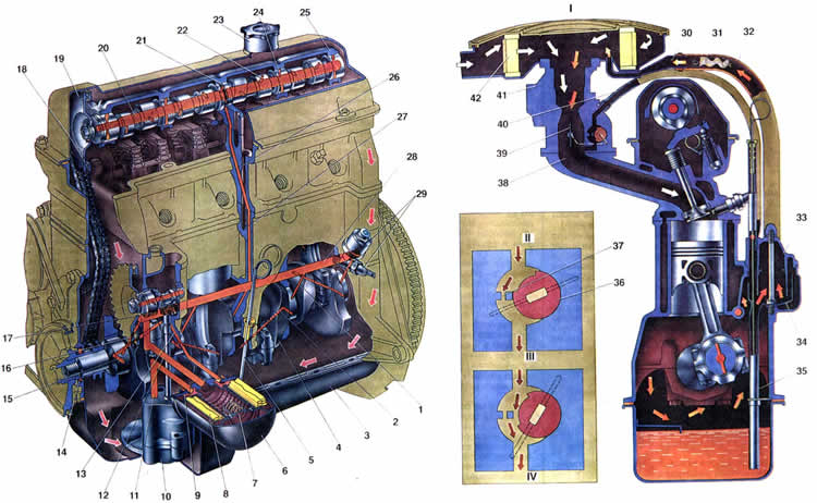 Под давлением смазываются коренные и шатунные подшипники, опоры распределительного вала, втулка шестерни и валика привода масляного насоса и распределителя зажигания. Маслом, вытекающим из зазоров и разбрызгиваемым движущимися деталями, смазываются стенки цилиндров, поршни с поршневыми кольцами, поршневые пальцы в бобышках поршня, цепь привода газораспределительного механизма, опоры рычагов привода клапанов, а также стержни клапанов в их направляющих втулках.