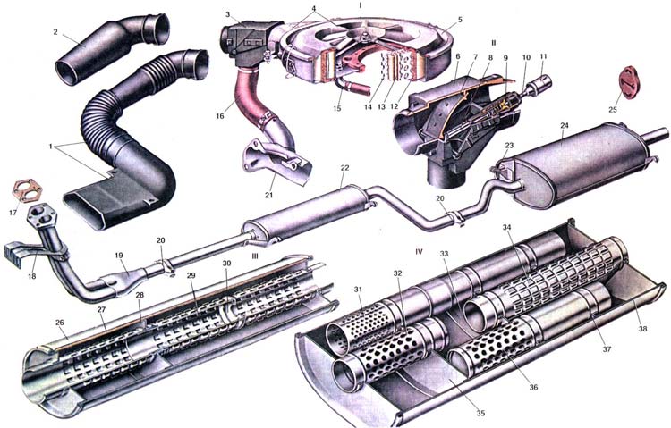 | Воздушный фильтр сухого типа со сменным фильтрующим элементом. Корпус фильтра крепимся на четыре шпильки карбюратора самоконтрящимися гайками и уплотняется резиновой прокладкой. Фильтр состоит из корпуса, крышки 5, фильтрующего элемента 13, воздухозаборника 2 холодного воздуха и воздухозаборника 21 теплого воздуха с гофрированным шлангом 16. Корпус и крышка штампуются из листовой стали и окрашиваются черной грунтовкой. Крышка 5 крепится к корпусу четырьмя пружинными защелками и в центре дополнительно гайкой за шпильку кронштейна. Кронштейн приваривается к корпусу воздушного фильтра. Герметичность корпуса с крышкой обеспечивается уплотнительной прокладкой из пенополиуретана, приклеенной к крышке фильтра. Крышка фильтра устанавливается строго определенным образом, чтобы исключить повышение шума впуска. Выштампованные на крышке и приемном патрубке стрелки 4 должны быть направлены навстречу друг другу. Сухой фильтрующий элемент 13 взаимозаменяем с фильтрующим элементом двигателя ВАЗ 2121. Фильтрующая часть элемента имеет вид гармошки, которая изготавливается из специального фильтровального картона и залита вместе с внутренней 14 и наружной перфорированными оболочками из жести в эластичные крышки из самозатвердевающего герметика, за счет чего при установке крышки 5 воздушного фильтра фильтрующий элемент надежно герметизируется с корпусом и крышкой. Для увеличения пылеемкости фильтрующего элемента на наружную перфорированную оболочку надевается предочиститель 12 из синтетической ваты. Корпус воздушного фильтра имеет приемный патрубок, через который всасывается воздух, и коллектор 15 вытяжной вентиляции картера двигателя. Картерные газы отсасываются по шлангу через коллектор 15 в воздушный фильтр, в пространство за фильтрующим элементом, где они смешиваются с очищенным воздухом и поступают в карбюратор. На приемном патрубке корпуса стяжным болтом крепится пластмассовый терморегулятор 3 с установленным на нем воздухозаборником 2 холодного воздуха. Для снижения шума впуска воздухозаборник изготавливается из пенополиуретана Нижний патрубок терморегулятора соединяется гофрированным шлангом 16 с воздухозаборником 21 теплого воздуха, забирающим воздух из зоны выпускного коллектора. На автомобилях ВАЗ-2109 воздухозаборник 1 холодного воздуха с воздухопроводом имеет другую конструкцию, отличную от ВАЗ-2108. Терморегулягор 3 при прогретом двигателе поддерживает температуру воздуха, поступающего в воздушный фильтр, в пределах 25-35'С. Терморегулятор состоит из пластмассового разборного корпуса 6, шарнирно установленной заслонки 7, тяги 8 и термосилового элемента 11. Нижнее плечо заслонки соединяется шарнирно с составной тягой 8. Тяга вторым концом прижимается пружиной к толкателю 9 термосилового элемента. Шток 10, жестко связанный с термосиловым элементом, ввертывается в пробку корпуса терморегулятора. Термочувствительный наполнитель термосилового элемента 11 при нагревании расширяется и воздействует на толкатель 9, который через тягу 8 прикрывает заслонку 7. Термосиловой элемент омывается всасывающим воздухом и при температуре воздуха выше +35"С перекрывает заслонкой патрубок поступления теплого воздуха. Наоборот, при температуре воздуха ниже *-25"С заслонка перекрывает патрубок поступления холодного воздуха. Возду