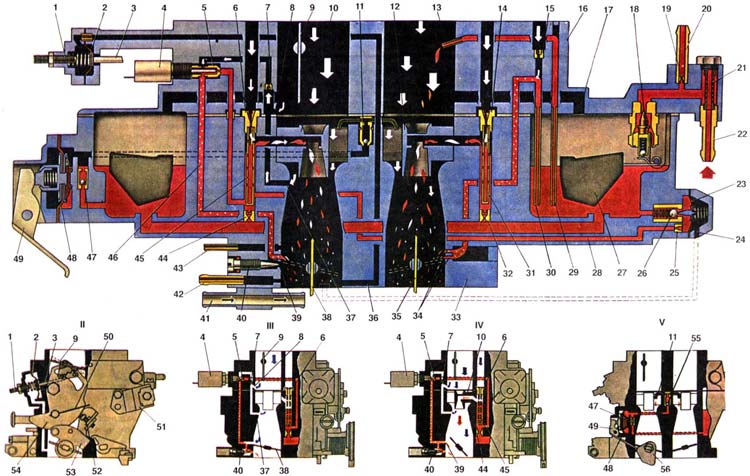 | Главная дозирующая система запитывается из поплавковой камеры, в которую топливо поступает через игольчатый клапан 18. Через главные топливные жиклеры 44 н 32 топливо поступает в эмульсионные колодцы. При достаточных разрежениях в распылителях главных дозирующих систем топливо смешивается в эмульсионных колодцах с воздухом, поступающим через главные воздушные жиклеры 6 и 14, и в виде эмульсии всасывается в диффузоры смесительных камер. На режиме дросселирования работает только главная дозирующая система первой камеры. Вторая камера начинает открываться и работать, когда дроссельная заслонка первой камеры откроется более чем на две трети. Система холостого хода обеспечивает необходимый состав горючей смеси на холостом ходу. При этом дроссельные заслонки 38 и 35 закрыты. Топливо из эмульсионного колодца главной дозирующей системы поднимается по топливному каналу, проходит топливный жиклер 5, смешивается с воздухом из воздушного жиклера 7 и проточного канала и далее поступает под винт 40 качества смеси и в задроссельное пространство. Переходная система первой камеры обеспечивает плавный переход работы двигателя с холостого хода на режимы дросселирования. В момент открытия дроссельной заслонки первой камеры щель 39 переходной системы попадает под разрежение. Из нее также будет поступать эмульсия, обеспечивая плавный переход. Переходная система второй камеры, обеспечивает плавный переход работы двигателя в момент начала открытия дроссельной заслонки второй камеры. В этот момент отверстия 34 попадают под разрежение; топливо из поплавковой камеры через жиклер 30 поднимается по трубке вверх, из воздушного жиклера 15 подмешивается воздух, и эмульсия по эмульсионному каналу поступает через выходные отверстия под дроссельную заслонку. Эконостат обогащает горючую смесь при полностью открытых дроссельных заслонках на скоростных режимах, близких к максимальным. При открытых дроссельных заслонках значительно возрастает разрежение в смесительных камерах и трубке 13 эконостата. Топливо из поплавковой камеры поступает через жиклер 29 эконостата и впрыскивающую трубку 13 во вторую смесительную камеру. Экономайзер мощностных режимов предотвращает изменение степени обогащения смеси за счет пульсации разрежения под дроссельной заслонкой, особенно при уменьшении частоты вращения коленчатого вала, когда возрастает пульсация и уменьшается разрежение. Шариковый клапан 26 экономайзера закрыт, пока диафрагма 23 удерживается разрежением под дроссельной заслонкой. При значительном открытии дроссельной заслонки 38 разрежение несколько снижается, и пружина диафрагмы открывает клапан. Топливо проходит через клапан, жиклер 25 экономайзера, добавляется к топливу, проходящему через главный топливный жиклер 44, и выравнивает обогащение смеси. Ускорительный насос диафрагменного типа с приводом от кулачка на оси дроссельной заслонки первой камеры. При резком открытии дроссельной заслонки кулачок нажимает на рычаг 49 и через пружину в толкателе действует на диафрагму 48, преодолевая сопротивление возвратной пружины. Диафрагма подает топливо через шариковый клапан подачи и впрыскивает его через распылители 11 в смесительные камеры. При обратном ходе диафрагмы под действием возвратной пружины из поплавковой камеры засасывается топливо че
