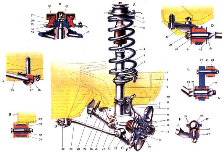 | Подвеска состоит из направляющего устройства, упругих и гасящих элементов. Направляющее устройство подвески определяет перемещение колес относительно кузова, а также передает силы и моменты от колес на кузов. К направляющему устройству относятся нижний рычаг 22 подвески и телескопическая стойка 9, соединенные между собой поворотным кулаком 13. Телескопическая стойка дополнительно выполняет функции гасящего элемента. К направляющему устройству относится также штанга стабилизатора поперечной устойчивости, выполняющая одновременно и роль растяжки рычага подвески. Нижний рычаг 22 подвески откован из стали. Он крепится к кронштейну 28 кузова болтом с гайкой и пружинной шайбой. В головку рычага, через которую проходит болт крепления, запрессован резинометаллический шарнир, состоящий из резиновой 31 и металлической 32 втулок. При качании рычага происходит упругая деформация резиновой втулки. Проворачивание втулок 31 и 32 относительно друг друга или резинометаллического шарнира на головке рычага и относительно болта крепления не допускается. Для стабилизации рычага подвески он с одной стороны распирается растяжкой 29, а с другой штангой 25 стабилизатора поперечной устойчивости. Растяжка соединяется с рычагом через два резинометаллических шарнира, запрессованных в отверстия рычага. Резиновая втулка 44 шарнира запрессована между двумя металлическими втулками, и оба шарнира зажаты в отверстии рычага самоконтрящейся гайкой между двумя шайбами 42. Другой конец растяжки соединяется с кронштейном 30, который крепится к кузову тремя болтами. В кронштейне растяжки запрессован резинометаллический шарнир, состоящий из резиновой 41 и металлической 40 втулок. Шарнир зажимается на растяжке самоконтрящейся гайкой между шайбами 42. С обеих сторон растяжки установлены регулировочные шайбы 23, которыми регулируется продольный угол наклона оси поворота. На растяжке с одной стороны выполнен шестигранник, с другой лыски под ключ для удержания растяжки при повороте гаек растяжки. Штанга 25 стабилизатора поперечной устойчивости соединяется с рычагом подвески при помощи короткой стойки 24, имеющей две головки. В нижнюю головку запрессован резинометаллический шарнир, через который проходит болт крепления стойки к рычагу подвески. В другую головку запрессована резиновая втулка, через которую проходит конец штанги стабилизатора. Средняя (торсионная) часть ее крепится к лонжеронам кузова двумя кронштейнами 27, в которых расположены подушки 26. Отверстия в кронштейнах под болты крепления выполнены овальными, что облегчает установку штанги на автомобиль. Наружный конец рычага подвески соединяется через шаровой шарнир 21 с поворотным кулаком 13. Палец шарнира заходит в коническое отверстие рычага и крепится самоконтрящейся гайкой. Шаровой шарнир состоит из неразъемного корпуса 45, в котором залит специальной смолой подшипник 46, изготовленный из низкофрикционной тефлоновой ткани. Он охватывает шаровую головку пальца 47. Внутренняя полость шарнира герметизируется защитным армированным чехлом 48. При сборке шарнира в чехол закладывается смазка ШРБ -4, рассчитанная на весь срок службы шарнира при условии сохранения герметичности чехла. Корпус шарнира крепится снизу болтами к поворотному кулаку 13. Верхняя часть поворотного кулака крепится к кронштей