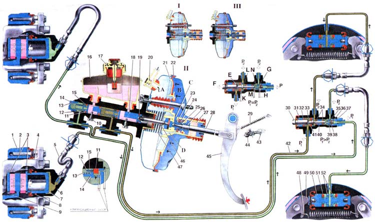 | При нажатии на педаль тормоза она отходит от наконечника 44 выключателя стоп-сигнала, и цепь лампы замыкается, вследствие чего лампа стоп-сигнала загорается. Одновременно перемещается толкатель 28 вместе с поршнем 23 и корпусом 21 клапана. Вслед за поршнем перемещается под действием пружины 25 клапан до упора в седло клапана. При прилегании к седлу клапан разобщает камеры А и В. При дальнейшем перемещении поршня 23 его торец отходит от клапана 24 и через образовавшийся зазор камера В сообщается с атмосферой. Поэтому атмосферный воздух поступает в камеру В через фильтр 27, через образовавшийся зазор между поршнем и клапаном и далее через канал С. Атмосферный воздух создает давление на диафрагму 22. За счет разности давления в камерах А и В и силы нажатия на педаль тормоза корпус клапана перемещается вместе со штоком 46, который в свою очередь воздействует на поршень 18 главного цилиндра. При перемещении поршня 18 распорное кольцо отходит от стопорного винта 10, и уплотнительное кольцо 11 прижимается пружиной 15 к торцу канавки поршня. Компенсационный зазор перекрывается, и происходит разобщение главного цилиндра и бачка. При дальнейшем перемещении поршня 18 в рабочей полости привода "левый передний - правый задний тормоза" создается давление жидкости, которое через трубопроводы передается в колесные цилиндры тормозных механизмов. Оно же воздействует и на плавающий поршень 14, который, перемещаясь, создает давление в контуре "правый передний - левый задний тормоза". Под увеличивающимся давлением жидкости кольца 11 высокого давления начинают распираться и плотнее прилегать к стенкам цилиндра и к торцу канавок, что улучшает уплотнение поршней в цилиндре. При увеличении давления в контурах возрастает усилие на поршень 30 регулятора давления, которое стремится выдвинуть его из корпуса регулятора. Когда усилие от давления жидкости начинает превышать усилие от упругого рычага, поршень начинает выдвигаться из корпуса. Вслед за поршнем под усилием пружины втулки толкателя и пружины 36 смещается толкатель 40 вместе с втулкой и кольцами 34. При этом зазор М между тарелкой и седлом 35 увеличивается, а зазоры Н и К уменьшаются. Когда зазор Н выберется полностью и клапан 38 изолирует камеру G от камеры N, толкатель 40 вместе с расположенными на нем деталями прекращает движение вслед за поршнем. С этого момента давление в камере N будет изменяться в зависимости от давления в камере L. При дальнейшем увеличении усилия на педали тормоза давление в камерах Е, G и L возрастает, и поршень будет продолжать выдвигаться из корпуса. Одновременно под давлением жидкости втулка толкателя вместе с уплотнительными кольцами 34 и тарелкой пружины втулки толкателя будут сдвигаться в сторону пробки 37. При этом зазор М и объем камеры N будут уменьшаться. При уменьшении объема камеры N давление в ней, а значит и в приводе заднего колеса, будет нарастать и практически всегда будет равно давлению в камере 1_. Когда зазор К выберется полностью, то есть головка поршня 30 коснется уплотнителя 41, давление в камере L, а значит и в камере N, будет расти в меньшей степени по сравнению с камерой Е и только за счет дросселирования жидкости между головкой поршня и уплотнителем 41. Зависимость давления в камерах L и Е определяется отношением разности площадей головки и штока поршня к площади головк