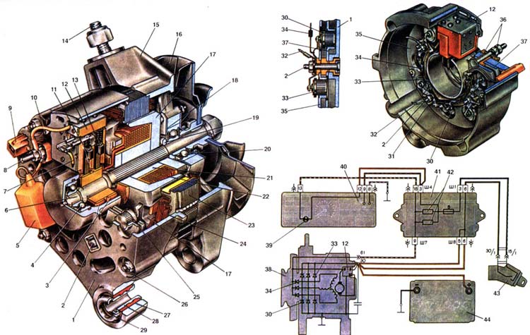 | На автомобилях ВАЗ-2108, -2109 применяется трехфазный генератор переменного тока типа 37.3701 со встроенным выпрямительным блоком и микроэлектронным регулятором напряжения. Он служит для питания потребителей электрическим током и для зарядки аккумуляторной батареи. Максимальная сила тока отдачи генератора (при 13 В и 5000 об/мин) составляет 55 А, а пределы регулируемого напряжения 14,1+0,5 В. Основные части генератора: ротор, статор, крышка 1 с выпрямительным блоком 25, крышка 15 с подшипником 20, шкив с вентилятором 16 и щеткодержатель с регулятором напряжения 12. Крышки и статор стянуты в единое целое четырьмя стяжными болтами 26. Ротор генератора представляет собой вращающийся электромагнит. Стальные клювообразные полюсные наконечники 17 и втулка 21, напрессованные на вал 6 ротора, образуют сердечник электромагнита. Между полюсными наконечниками в пластмассовом каркасе находится обмотка 22 ротора, называемая обмоткой возбуждения. Ток в обмотку подводится через медные контактные кольца 3, к которым припаяны выводы обмотки. Вал ротора вращается в двух шариковых подшипниках 4 и 20, установленных в крышках 1 и 15. Подшипники закрытого типа. Смазки, заложенной в них при изготовлении, достаточно на весь срок службы генератора. Задний подшипник 4 напрессован на вал ротора, а его наружная обойма поджимается резиновым кольцом, помещенным в канавку крышки. Передний подшипник 20 запрессован в крышку 15 и для надежности зажат между двумя стальными шайбами 18, стянутыми четырьмя винтами. Концы винтов раскернены. Внутренняя обойма этого подшипника, вместе с дистанционным кольцом 19, зажата гайкой крепления шкива между ступицей шкива и ступенькой вала. Статор генератора состоит из сердечника 23 с обмоткой 24. Сердечник набран из пластин электротехнической стали, соединенных в четырех местах электросваркой. В пазах сердечника уложена трехфазная обмотка статора, концы которой соединены в звезду без вывода нулевой точки. Выпрямитель, преобразующий переменный ток генератора в постоянный, выполнен в виде выпрямительного блока 25. Он представляет собой две алюминиевые пластины с запрессованными в них шестью диодами типа ВА-20 полупроводниковыми приборами, пропускающими ток только в одном направлении. Для упрощения конструкции выпрямителя применены диоды разной полярности "положительные" и "отрицательные". У положительных диодов на корпусе создается "плюс" выпрямленного напряжения, а у отрицательных "минус". Положительные диоды запрессованы в пластину 35 выпрямительного блока, а отрицательные - в пластину 37. Выпрямительный блок крепится к крышке 1 тремя болтами 2, изолированными вместе с пластиной 35 положительных диодов от крышки пластмассовыми втулками. Гайками болтов 2 одновременно зажимаются выводы диодов и обмотки статора. С пластиной 35 соединен зажим "30" (8) генератора, являющийся выводом "плюс" выпрямителя. Выводом "минус" является масса генератора. На пластине 35 выпрямительного блока установлены также и три дополнительных диода 34. Напряжение, снимаемое с этих диодов, идет для питания обмотки возбуждения 22 и схемы контроля исправности генератора с помощью контрольной лампы 39 разряда аккумуляторной батареи. Напряжение генератора регулируется микроэлектронным бесконтактным регулятором напряжения 12, закрепленным винтом на крышке 1. Это неразборный и нерегу