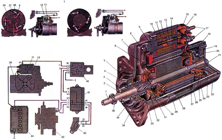 | Для раскручивания коленчатого вала двигателя до частоты, при которой он начнет работать (т.е. для пуска двигателя), применяется стартер типа 29.3708. Он проворачивает коленчатый вал шестерней за зубчатый венец маховика. Мощность стартера составляет 1,3 кВт при потребляемой силе тока 260 А. Стартер представляет собой четырехполюсный электродвигатель постоянного тока со смешанным возбуждением, с дистанционным электромагнитным включением и роликовой муфтой свободного хода. Он состоит из следующих основных частей: корпуса 29, якоря с муфтой свободного хода и шестерней 2 привода, двух крышек 7 и 24 и тягового реле 10. Корпус и крышки соединены вместе двумя стяжными болтами. Внутри стального корпуса 29 закреплены винтами четыре стальных полюса 28 с катушками обмотки возбуждения. Корпус вместе с полюсами и обмоткой представляет собой статор стартера. Три катушки обмотки (сериесные) соединены с обмоткой якоря последовательно, а одна (шунтовая) параллельно. Поэтому возбуждение стартера и называется смешанным. Оно позволяет получить большой крутящий момент в заторможенном состоянии и сравнительно низкую частоту вращения якоря на холостом ходу, что уменьшает износ втулок подшипников и облегчает условия работы муфты свободного хода. Между полюсами статора вращается якорь, собранный на валу 1. Сердечник 26 якоря набран из пластин электротехнической стали, напрессованных на среднюю часть вала. По окружности сердечника имеются продольные пазы, изолированные картоном, в которых находится обмотка 25 якоря, выполненная медной лентой. Концы обмотки припаяны к пластинам коллектора и для большей надежности зачеканены. Вал якоря вращается в двух металлокерамических вгудках. Задняя втулка 21 запрессована в крышке 24, а передняя расположена в картере сцепления и передний конец вала якоря входит в нее при установке стартера в гнездо картера сцепления. Особенностью стартера 29.3708 является торцевой коллектор 18, напрессованный на заднюю часть вала якоря. Применение его позволило уменьшить длину и "массу" стартера. Кроме того, торцевой коллектор способствует более стабильной и длительной работе щеточного контакта. Коплмтос выполнен в виде: пластмассового диска с залитыми в нем медными пластинами. На переднем конце вала якоря расположена муфта свободного хода с шестерней 2 привода. При пуске двигателя муфта передает крутящий момент от вала якоря на шестерню, а после пуска разобщает шестерню и вал якоря, и поэтому вращение маховика на вал не передается. В результате якорь защищается от "разноса" повреждения центробежными силами из-за чрезмерной частоты вращения. Муфта состоит из наружного кольца 34, приклепанного к ступице 35. и внутреннего кольца, составляющего одно целое с шестерней 2. В пазах наружного кольца находятся ролики 4 с пружинами, плунжерами 38 и направляющими стержнями 37. Все они вместе с наружным кольцом и двумя упорными полукольцами завальцованы в стальном кожухе 5. Пазы наружного кольца имеют переменную ширину. В широкой части паза ролики могут свободно вращаться, а в узкой части заклиниваются между наружным и внутренним кольцами муфты. Тяговое реле прикреплено к крышке 7. С его помощью дистанционно управляют включением стартера. Реле замыкает цепь питания обмоток якоря и статора, а также через рычаг 8 вводит шестерню 2 в зацепление с венцо