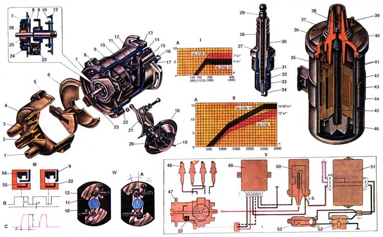 | Бесконтактная система зажигания, применяемая на автомобилях ВАЗ-2108, -2109, состоит из следующих узлов: датчика-распределителя зажигания, коммутатора, свечей зажигания, катушки зажигания, выключателя зажигания и проводов высокого напряжения. Датчик-распределитель зажигания. Применяется типа 40 3706 на двигателях 2108 и 21083 или 40.3706- 10 на двигателях 21081 и служит для выдачи управляющих импульсов низкого напряжения на коммутатор и для распределения импульсов высокого напряжения по свечам зажигания. Эти датчики-распределители четырех искровые с вакуумным и центробежным регуляторами опережения зажигания и с бесконтактным микроэлектронным датчиком управляющих импульсов. Они отличаются только характеристиками вакуумного и центробежного регуляторов опережения зажигания. Датчик-распределитель зажигания установлен на корпусе вспомогательных агрегатов (см. рис. 4) и приводится во вращение непосредственно от заднего конца распределительного вала через муфту 16. Валик вращается в двух металлокерамических втулках 17 и 25. Втулка 17 смазывается маслом из системы смазки двигателя, а втулка 25 окружена войлочным кольцом 26, пропитанным маслом, которого достаточно на весь срок службы. На валике расположены детали центробежного регулятора опережения зажигания: ведущая пластина 12 с грузиками 11 и ведомая пластина 10. Ведущая пластина закреплена на валике, а ведомая вместе с экраном 9 составляет одно целое с втулкой, надетой на валик. Втулка в небольших пределах может поворачиваться на валике. Бесконтактный датчик 22 закреплен на пластине 8 и действует на основе эффекта Холла, который заключается в возникновении поперечного электрического поля в пластинке полупроводника с током при действии на нее магнитного поля. Датчик состоит из полупроводниковой пластинки с интегральной микросхемой 55 и постоянного магнита 54 с магнитопроводом. Между пластинкой и магнитом имеется зазор, в котором находится стальной экран 9 с четырьмя прорезями. Когда через зазор датчика проходит тело экрана (см. рисунок), то магнитные силовые линии замыкаются через экран и на пластинку не действуют. Поэтому разность потенциалов в пластинке не возникает. Если же в зазоре находится прорезь экрана, то на пластинку полупроводника действует магнитное поле и с нее снимается разность потенциалов. Интегральная микросхема, встроенная в датчик, преобразует разность потенциалов, возникающую на пластинке, в импульсы напряжения отрицательной полярности. Таким образом, когда тело экрана находится в зазоре датчика, то на его выходе имеется напряжение U 4max О, примерно на 3 В меньше напряжения питания. Если же через зазор датчика проходит прорезь экрана, то напряжение U 4min О на выходе датчика близко к нулю (не более 0,4 В). Коммутатор. Электронный коммутатор 49 служит для прерывания тока в первичной цепи катушки зажигания по сигналам бесконтактного датчика. Могут применяться взаимозаменяемые коммутаторы различных марок: 3620.3734, HIM -52. ВАТ10.2, RTI903 или PZE4020. Для прерывания тока служит специальный мощный высоковольтный транзистор. В схеме коммутатора имеется устройство для автоматического регулирования периода t 4н О накопления тока 1 41 0 в катушке зажигания в зависимости от частоты вращения коленчатого вала. Величина импульсов тока 1 41 0 составляет 8-9 А. Кроме того, предусмотрено автоматическое отк
