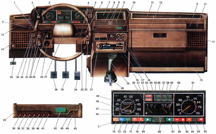 | 1.Рычаг переключателя световой сигнализации 2. Переключатель наружного освещения 3. Комбинация приборов. 4. Выключатель зажигания 5. Выключатель аварийной сигнализации 6. Рычаг переключателя стеклоочистителей и смывателей. 7. Гнездо для установки радиоаппаратуры. 8. Центральные сопла системы вентиляции и отопления салона. 9. Рычажки закрытия сопел. 10. Маршрутный компьютер. Устанавливается по заказу и предназначен для измерения, накопления и выдачи на цифровой дисплей одного из семи параметров: - времени в пути* - средней скорости движения; - пройденного пути; - суммарного, среднего или текущего расхода топлива; - текущего времени. Перед поездкой при нажатии на кнопку "START" устанавливаются в ноль значения всех параметров, за исключением "текущего расхода топлива" и "текущего времени". Цифровой дисплей последовательно индицирует значение параметра после нажатия на соответствующую кнопку управления. При выключении зажигания отключается индикатор маршрутного компьютера, но накопленная информация и ход часов сохраняются. В случае отключения аккумуляторной батареи происходит потеря всей накопленной информации. 11. Панель приборов. 12. Вещевой ящик. 13. Боковые сопла системы вентиляцни и отопления салона. 14. Облицовка громкоговорителя. 15. Журнальная полка. 16. Выключатели электростекдоподъемников устанавливаются на автомобилях, оборудованных электроприводами стеклоподъемников передних дверей. При нажатии на верхнее или нижнее плечо клавиши происходит соответственно подъем или опускание стекла. 17. Прикуриватель18. Пульт управления системой вентиляции и отопления салона 19. Рычаг переключения передач 20. Рычаг стояночного тормоза 21. Пепельница. 22. Рукоятка управления воздушной заслонкой карбюратора 23. Выключатель очистителя и смывателя фар устанавливается на части автомобилей. Нажатием на кнопку выключателя при включенном ближнем свете включаются очистители и омыватель фар. 24. Педаль акселератора. 25. Педаль тормоза. 26. Педаль сцепления. 27. Выключатель звукового сигнала. 28. Выключатель (регулятор) освещения приборов 29. Рукоятка гидрокорректора фар 30. Выключатели обогрева передних сидений устанавливаются на автомобилях, оборудованных системой обогрева сидений и включаются нажатием на нижнее плечо клавиши. О включенном обогреве сигнализирует контрольная лампа в самой клавише. 31. Выключатель заднего противотуманного света 32. Выключатель противотуманных фар подключается на автомобилях с установленными противотуманными фарами и включается нажатием на клавишу при включенном наружном освещении. 33.Выключатель обогрева заднего стекла. 34. Рычаг привода замка капота. 35. Кнопка времени в пути индицирует время в часах и минутах до значения 99.59, не включая остановки и стоянки с выключенным зажиганием. 36. Кнопка средней скорости движения индицирует среднюю скорость движения автомобиля в км/ч, не включая остановки и стоянки с выключенным зажиганием. 37. Кнопка пройденного пути индицирует пройденное расстояние в км до значения 999,9. 38. Кнопка суммарного расхода топлива индицирует расход топлива в литрах до значения 624,9. 39. Кнопка среднего расхода топлива индицирует расход топлива в л/км пути. 40. Кнопка текущего расхода топлива индицирует расход топлива на данный момент в л/км при скорости движения автомобиля более 10 км/ч или в л/ч при скорости 