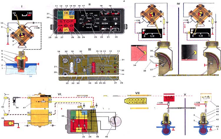 | Все контрольные приборы и контрольные лампы автомобиля объединены в единый узел комбинацию приборов типа 22.3801. Комбинаций приборов объединяем в себе спидометр 16, эконометр 22, вольтметр 19. указатель 20 уровня топлива и указатель 18 температуры охлаждающей жидкости. Кроме того, слева в отдельной секции размещены контрольные лампы. Электрические соединения между приборами, контрольными лампами и выводными штекерами выполнены методом печатного монтажа на плате из фольгированного гетинакса. Спидометр 16 крепится к корпусу комбинации приборов двумя винтами. Он имеет стрелочный указатель скорости и два счетчика: суммирующий 23 и суточный 17 пройденного пути, показания которого можно устанавливать на нуль рукояткой, вынесенной на панель приборов. Механизмы спидометра приводятся в действие гибким валом от привода, установленного на картере сцепления. Один оборот гибкого вала соответствует 1 м пройденного пути. Эконометр, установленный в комбинации приборов, служит для ориентировочного определения расхода топлива на данном режиме работы двигателя. Он представляет собой вакуумметр, измеряющий разрежение во впускной трубе двигателя, с которым непосредственно связан расход топлива. Чем меньше открыты дроссельные заслонки в карбюраторе, тем больше разрежение во впускной трубе, а расход топлива меньше. И наоборот, при больших нагрузках на двигатель дроссельные заслонки открываются почти полностью, разрежение падает (стрелка эконометра переходит в желтую зону шкалы), а расход топлива увеличивается. Указатель температуры охлаждающей жидкости работает в паре с датчиком ТМ-106. Механизм прибора состоит из пластмассового разъемного каркаса 7, на котором намотаны катушки, и оси со стрелкой и дисковым постоянным магнитом 10. В задней половине каркаса находится небольшой магнит 8, возвращающий дисковый магнит со стрелкой в начало шкалы. Катушки имеют три обмотки, одна из которых намотана перпендикулярно двум другим. Таким образом, на дисковый магнит действуют три магнитных потока, создаваемых тремя обмотками. В зависимости от сопротивления датчика меняется величина силы тока в обмотках катушек и поэтому меняются направление и величина суммарного магнитного потока, действующего на дисковый магнит. Полюса этого магнита располагаются вдоль направления суммарного магнитного потока и, соответственно, стрелка отклоняется на определенный угол. Если сопротивление датчика составляет 640-1320 Ом. стрелка должна находиться в начале шкалы, при сопротивлении 77-89 Ом в начале красной зоны, а при сопротивлении датчика 40- 50 Ом отклоняться до конца красной зоны шкалы. Датчик ТМ-Юб указателя температуры заворачивается в головку цилиндров с задней стороны двигателя. Чувствительным элементом в датчике является терморезистор 1, изменяющий свое сопротивление при изменении температуры. Терморезистор прижат пружиной к донышку корпуса, т.е. одна его сторона через корпус соединена с "массой". Другая сторона через пружину соединена со штекером, закрепленным в пластмассовой крышке 6. Указатель уровня топлива имеет такое же устройство. как и указатель температуры. Отличается данными обмоток, точками крепления к печатной плате и взаимным расположением дискового магнита и стрелки. Указатель применяется в паре с датчиком типа 24.3827, который устанавливается в т