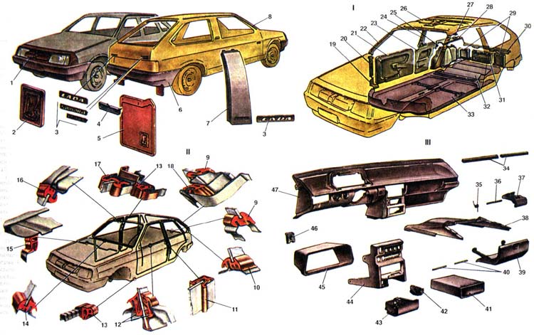 | Кузов окрашивается тремя-четырьмя слоями синтетической эмали. Спереди и сзади кузов прикрывается бамперами. Облицовки бамперов изготавливаются из микропористого пенополиуретана черного цвета с добавкой измельченного стекловолокна и крепятся к алюминиевым балкам. С помощью кронштейнов бамперы устанавливаются на каркасе кузова. Решетка 1 и облицовка радиатора, как и облицовки бамперов, делаются из пенополиуретана и окрашиваются под цвет кузова. К решетке радиатора крепится заводской знак 2, который выполнен из пластмассы под "хром" на матовом фоне. На сточные желобки кузова устанавливаются пластмассовые окантовки 8 черного цвета и крепятся за счет их упругости. Центральные стойки автомобиля ВАЗ- 2108 снаружи закрываются пластмассовыми облицовками 7 матового черного цвета. По задним кромкам облицовок выполнены решетки вытяжной вентиляции салона кузова. На правой облицовке центральной стойки и панели задка крепятся орнаменты 3. Надписи на пластмассовых орнаментах делаются под "хром". Фон орнаментов имеет тиснение. Задние колеса имеют фартуки 5, которые крепятся планками 4 к кронштейнам кузова. Внутренняя отделка салона кузова по форме и цвету подбирается в едином стиле, отвечающем современным эстетическим требованиям. Все отделочные материалы облицовок и обивок имеют матовую поверхность, не дающую бликов. Цвет обивок дверей, сидений, боковин подбирается в зависимости от цвета кузова. Черный цвет имеют ручки дверей, облицовка и обивка задка кузова, обивка двери задка, обивки стоек, полка задка и опоры полки, коврики полов, облицовки порогов. Обивка панели приборов и накладка панели черного или коричневого цвета. Обивка 26 крыши для уменьшения веса и термошумоизоляции изготавливается из пенополиуретана, цельноформованного со стекловолокном с обеих сторон. Со стороны салона обивка покрывается поливинилхлоридной пленкой с дублированием пенополиуретаном. По задней кромке к обивке закрепляется пластмассовая накладка. Крепление обивки крыши осуществляется впереди креплением противосолнечных козырьков с по мощью самонарезающих винтов, с боков поручнями, в центре плафоном и сзади четырьмя кнопками Обивка стоек 22, 24, 27 кузова изготавливается из пластмассы АБС толщиной 2 мм. Обивка 22 стоек ветрового стекла крепится тремя самонарезающими винтами, обивка 24 центральной стойки крючком и кнопкой. Обивка 27 задней стойки крепится двумя винтами и креплением ремня безопасности. Обивка 19 и 20 боковин изготавливается для облегчения демонтажа и монтажа из двух частей и крепится самонарезающими винтами. Средние обивки боковин 23 и обивки 21 передних дверей крепятся в отверстия внутренних панелей пластмассовыми держателями, закрепленными с внутренней стороны обивок. Обивки дверей 21, боковин 19, 20 и 23, арок задних колес 25 изготавливаются из пластмассы АБС. Панель приборов 47 изготавливается из энергопоглощающего материала и состоит из самой панели, выполненной из пластмассы толщиной 3 мм и накладки, которая крепится сверху панели. Накладка изготавливается из металлического каркаса и покрывается энергопоглощающим слоем пенополиуретана. Сверху накладка облицовывается декоративной пленкой. Полы салона и багажного отделения покрываются коврами 33 и 32 черного цвета, формованного из нетканого материала облегченного типа с основой поли