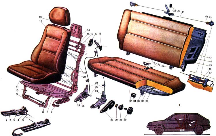 | Передние сиденья анатомические, раздельные, типа кресел с подголовниками, с бесступенчатой регулировкой наклона спинок. Каждое сиденье устанавливается на двух салазках и качающейся стойке 10. Стойка устанавливается шарнирно в передних кронштейнах 9, которые шпильками крепятся к полу кузову. Для облегчения перемещения сиденья вперед стойки имеют два тор- сиена 8, нижние концы которых вставляются в отверстия кронштейнов, верхние концы заводятся в упоры, приваренные к стойке- Сиденье может передвигаться вперед и назад на 119 мм Основание 7 подушки 11 сиденья состоит из прочных стальных рамок и пола подушки, штампованного из листовой стали. К полу приварен усилитель. Основание спинки делается из прочных стальных рамок, к которым крепятся проволочные пружины 19. Для избежания скрипа концы пружин покрываются слоем полиамидной смолы. Основание спинки нижними звеньями 24 механизма регулирования наклона спинки соединяется шарнирно с основанием 7 подушки. К основанию 20 спинки привариваются направляющие 15 подголовника 13- Каркас 14 подголовника штампуется из листовой стали и крепится двумя стопорами в виде хомутов на круглой стойке подголовника - Концы стоек подголовника имеют по три выштампованных углубления для фиксации подголовника шплинтами 16, каждый из которых через прорезь в направляющих 15 подголовника прижимается в одно из углублений. Каждое из передних сидений имеет механизмы: передвижения сиденья вперед и назад, регулирования наклона спинки, откидывания спинки вперед для посадки пассажиров на заднее сиденье. Механизм передвижения сиденья имеет салазки, состоящие из направляющих 1 и ползунов 3, которые штампуются из листовой стали. Направляющие крепятся болтами к задним кронштейнам кузова- Ползуны могут перемещаться по направляющим на двух роликах каждый, вставленных между ползунами и направляющими. От выпадания роликов и сближения их направляющие имеют выштамповки на нижней плоскости в средней части и по концам. Ползуны имеют выштамповки на задних концах. В кольцевые выточки роликов устанавливаются резиновые кольца. Смещение ползунов вверх и в стороны ограничивается закраинами ползунов и направляющих. Ползуны шарнирно соединяются с основанием 7 подушки. Сиденье фиксируется в нужном положении защелками 4, каждая из которых поджимается пружиной в один из пазов гребенчатого фиксатора 2 механизма передвижения. Фиксаторы привариваются к направляющим. Рычаги защелок внутренних и наружных салазок соединяются между собой тягой 5. Защелка наружных салазок имеет стержень с ручкой 6 механизма передвижения сиденья. Механизм регулирования наклона спинки позволяет поворотом ручки 29 механизма изменять положение спинки. Для отдыха водителя или пассажира спинка переднего сиденья может устанавливаться в удобное положение. Максимальный угол наклона спинки назад составляет 80' от вертикали. Механизм состоит из двух пар верхних 23 и нижних 24 звеньев. Верхние звенья приварены сваркой к основанию 20 спинки. Между собой звенья соединены шарнирно с помощью двух эксцентриков и двух зубчатых пар внутреннего зацепления. При повороте ручки 29 поворачиваются оба эксцентрика, обеспечивая отклонение верхних звеньев 23 и в целом спинки переднего сиденья. Механизм откидывания спинки переднего сиденья обеспечивает посадку пассажиров на за