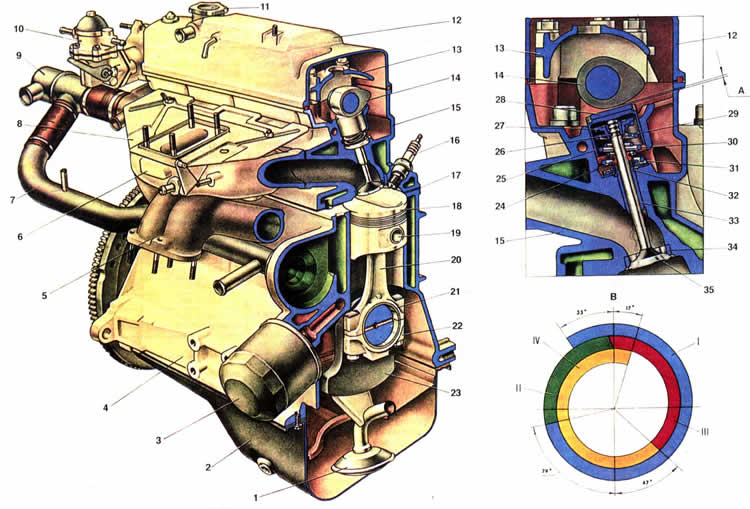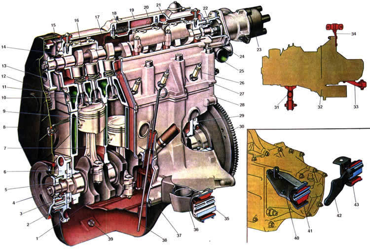 | 1. Коленчатый вал; 2. Крышка первою коренного подшипника; 3. Шкив привода распределительного вала; 4. Шкив привода генератора; 5. Передний сальник коленчатого вала; 6. Масляный насос; 7. Шатун; 8. Передняя защитная крышка зубчатого ремня; 9. Поршень; 10. Впускной клапан; 11. Выпускной клапан; 12. Ремень привода распределительного вала; 13. Шкив распределительного вала; 14. Задняя защитная крышка зубчатого ремня; 15. Сальник распределительного вала; 16. Передний корпус подшипников распределительного вала: 17. Распределительный вал; 18. Сетка маслоотделителя системы вентиляции картера; 19. Крышка головки цилиндров; 20. Крышка маслоотделителя; 21. Задний корпус подшипников распределительного вала; 22. Эксцентрик привода топливного насоса; 23. Датчик-распределитель зажигания; 24. Корпус вспомогательных агрегатов; 25. Отводящий патрубок рубашки охлаждения; 26. Свеча зажигания; 27. Головка цилиндров; 28. Блок цилиндров; 29. Держатель с задним сальником коленчатого вала: 30. Маховик: 31. Кронштейн с опорой передней подвески двигателя; 32. Силовой агрегат (двигатель с коробкой передач и сцеплением); 33. Кронштейн с опорой левой подвески двигателя; 34. Кронштейн с опорой задней подвески двигателя; 35. Опора передней подвески двигателя; 36. Кронштейн передней подвески двигателя; 37. Масляный картер; 38. Указатель уровня масла; 39. Пробка отверстия для слива масла из картера; 40. Кронштейн левой подвески двигателя; 41. Опора левой подвески двигателя; 42. Кронштейн задней подвески двигателя; 43. Опора задней подвески двигателя. 1. Приемник масляного насоса; 2. Масляный картер; 3. Масляный фильтр: 4. Блок цилиндров: 5. Выпускной коллектор; 6. Впускной трубопровод; 7. Подводящая труба насоса охлаждающей жидкости; 8. Теплоизолирующий экран карбюратора; 9. Термостат; 10. Топливный насос; 11. Крышка маслозаливной горловины; 12. Крышка головки цилиндров; 13. Передний корпус подшипников распределительного вала; 14. Распределительный вал; 15. Головка цилиндров; 16. Свеча зажигания; 17. Прокладка головки цилиндров; 18. Поршень; 19. Поршневой палец; 20. Шатун; 21. Вкладыш шатунного подшипника коленчатого вала; 22. Крышка шатуна; 23. Коленчатый вал; 24. Маслоотражательный колпачок; 25. Толкатель; 26. Сухарь клапана; 27. Тарелка пружин; 28. Регулировочная шайба; 29. Внутренняя пружина клапана; 30. Наружная пружина клапана; 31. Опорная шайба пружин; 32. Стопорное кольцо; 33. Направляющая втулка клапана; 34. Седло клапана; 35. Впускной клапан; 36. А.Зазор в механизме привода клапанов на холодном двигателе: 0,2 мм для впускных клапанов и 0,35 мм для выпускных; 37. В.Диаграмма фаз газораспределения; 38. I.Впуск горючей смеси; 39. II.Сжатие; 40. III.Рабочий ход; 41. IV.Выпуск. |