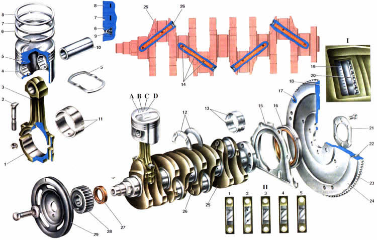 | Кривошипно-шатунный механизм служит для преобразования поступательного движения поршня под действием энергии расширения продуктов сгорания топлива во вращательное движение коленчатого вала. Механизм состоит из поршня с поршневыми кольцами и пальцем, шатуна, коленчатого вала и маховика. Поршень 4 отливается из высокопрочного алюминиевого сплава. Поскольку алюминий имеет высокий температурный коэффициент линейного расширения, то для исключения опасности заклинивания поршня в цилиндре в головке поршня над отверстием для поршневого пальца залита терморегулирующая стальная пластина 5. Поршни, так-же как и цилиндры, по наружному диаметру сортируются на пять классов: Измерять диаметр поршня для определения его класса можно только в одном месте: в плоскости, перпендикулярной поршневому пальцу на расстоянии 51,5 мм от днища поршня. В остальных местах диаметр поршня отличается от номинального, т.к. наружная поверхность поршня имеет сложную форму. В поперечном сечении она овальная, а по высоте коническая. Такая форма позволяет компенсировать неравномерное расширение поршня из-за неравномерного распределения массы металла внутри поршня. На наружной поверхности поршня нанесены кольцевые микроканавки глубиной до 14 микрон. Такая поверхность способствует лучшей приработке поршня, так как в микроканавках задерживается масло. В нижней части бобышек под поршневой палец имеются отверстия для прохода масла к поршневому пальцу. Для улучшения условий смазки в верхней части отверстий под палец сделаны два продольных паза шириной 3 мм и глубиной 0,7 мм, в которых накапливается масло. Ось отверстия под поршневой палец смещена на 1,2 мм от диаметральной плоскости поршня в сторону расположения клапанов двигателя. Благодаря этому поршень всегда прижат к одной стенке цилиндра, и устраняются стуки поршня о стенки цилиндра при переходе его через ВМТ. Однако, это требует установки поршня в цилиндр в строго определенном положении. При сборке двигателя поршни устанавливаются гак, чтобы стрелка на днище поршня была направлена в сторону передней части двигателя. По массе поршни сортируются на три группы: нормальную, увеличенную на 5 г и уменьшенную на 5 г. Этим группам соответствует маркировка на днище поршня: "Г", "+" и На двигателе все поршни должны быть одной группы по массе, чтобы уменьшить вибрации из-за неодинаковых масс возвратно-поступательно движущихся деталей. В запасные части поставляются поршни номинального размера только трех классов: А, С и Е. Этого достаточно для подбора поршня к любому цилиндру при ремонте двигателя, так как поршни и цилиндры разбиты на классы с некоторым перекрытием. Например, к цилиндрам классов В и О может подойти поршень класса С. Главное при подборе поршня обеспечить необходимый монтажный зазор между поршнем и цилиндром 0,025-0,045 мм. Кроме поршней номинального размера в запасные части поставляются и ремонтные поршни с увеличенным на 0,4 и 0,8 мм наружным диаметром. На днищах ремонтных поршней ставится маркировка в виде квадрата или треугольника. Треугольник соответствует увеличению наружного диаметра на 0,4 мм. а квадрат на 0,8 мм. Поршневой палец 10 стальной, трубчатого сечения, запрессован в верхнюю головку шатуна и свободно вращается в бобышках поршня. По наружному диаметру пальцы сортируются на три категории че