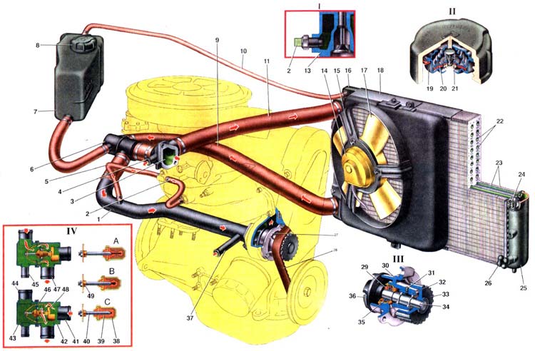 | Система охлаждения жидкостная закрытого типа с принудительной циркуляцией жидкости, с расширительным бачком 7. Система имеет насос 27 охлаждающей жидкости. неразборный термостат 6, электровентилятор, радиатор 18 с расширительным бачком 7, трубопроводы. шланги, сливные пробки. Привод насоса осуществляется от зубчатого ремня 28 привода распределительного вала. Вместимость системы, включая отопи- толь салона, составляет 7,8 л. Для контроля температуры жидкости имеется датчик 12, который завернут в рубашку охлаждения головки блока цилиндров. Указатель температуры жидкости устанавливается на комбинации приборов. При работе двигателя нагретая в рубашке охлаждения блока и головки блока цилиндров жидкость поступает через выпускной патрубок 3 по шлангу 11 в радиатор для охлаждения или в термостат 6, в зависимости от положения клапанов термостата. Далее охлаждающая жидкость всасывается насосом 27 и направляется в рубашку охлаждения двигателя. По шлангам 2 и 5 обеспечивается циркуляция жидкости и подогрев горючей смеси во впускной трубе и подогрев зоны дроссельной заслонки первой камеры карбюратора. К системе охлаждения через патрубки 4 и 37 шлангами подключается радиатор отопителя салона автомобиля. Насос охлаждающей жидкости 27 центробежного типа. Корпус 30 насоса изготавливается из сплава алюминия, валик 34 устанавливается в двухрядном шариковом подшипнике 32, который в корпусе стопорится винтом 31. Чтобы винт не ослабевал, контуры гнезда стопорного винта расчеканиваются после сборки. Подшипник не имеет внутренней обоймы, роль обоймы выполняет валик насоса. При сборке подшипник заполняется смазкой Литол-24 и в дальнейшем не смазывается. На передний конец валика напрессовывается зубчатый шкив 33, на задний крыльчатка 36. Зубчатый шкив изготавливается из металлокерамической композиции. К торцу крыльчатки. закаленному токами высокий частоты, на глубину 2-3 мм прижимается упорное уплотнительное кольцо 29 сальника 35, изготовленное из графитовой композиции. Сальник неразборный, запрессовывается в корпус насоса и предотвращает подтекание охлаждающей жидкости. Радиатор 18 разборный трубчатопластинчатый с пластмассовыми бачками 16 и 25. Сердцевина радиатора состоит из алюминиевых трубок 22 и алюминиевых охлаждающих пластин 23, крепится к пластмассовым бачкам и уплотняется резиновыми прокладками. Радиатор не имеет заливной горловины, верхний патрубок бачка 16 соединяется шлангом 10 с расширительным бачком. Левый бачок 16 имеет также подводящий и отводящий патрубки для подсоединения шлангов 11 и 9. Правый бачок 25 радиатора имеет сливную пробку 26 и датчик 24 включения и выключения электровентилятора. Расширительный бачок 7 изготавливается из полупрозрачной пластмассы, крепится ремнем к кронштейнам левого брызговика кузова. Нижний патрубок расширительного бачка соединяется шлангом с термостатом. Для предотвращения образования паровых пробок верхний патрубок бачка соединяется шлангом 10 с патрубком радиатора. Бачок имеет заливную горловину, закрываемую пластмассовой пробкой 8 с выпускным (паровым) 20 и впускным 21 клапанами. Клапаны в пробке устанавливаются в отдельном неразборном корпусе 19. Давление начала открытия выпускного клапана составляет 1,1 кгс/см'', впускного - 0,03- 0,13 кгс/см*. Для полного слива жидкости из системы должны быть вывернуты 