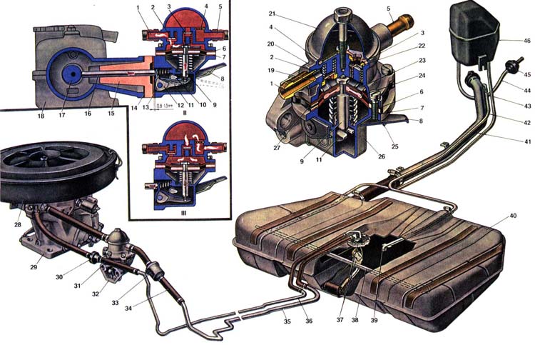 | Система питания включает следующие приборы: топливный бак 40, сепаратор 46 паров бензина, фильтр 33 тонкой очистки топлива, топливный насос 32, обратный клапан 30, двухходовой обратный клапан 45, топливопроводы и шланги, воздушный фильтр 28 с терморегулятором, карбюратор 29. впускную трубу и приборы выпуска отработавших газов. Подача топлива с обратным сливом части топлива от карбюратора обратно в топливный бак через калиброванное отверстие в патрубке карбюратора диаметром 0,70 мм. Обратный клапан 30, установленный на сливных шлангах, не допускает слива топлива из бака через карбюратор при опрокидывании автомобиля. Топливный бак соединяется шлангом 43 с сепаратором 46, который служит для конденсации паров бензина. Чтобы предотвратить вытекание топлива из бака через сепаратор, на втором шланге 44 сепаратора устанавливается обратный клапан двойного действия. Клапан работает в обоих направлениях: по мере расхода топлива пропускает атмосферный воздух в бак, а при повышении давления в баке выпускает воздух с парами топлива из топливного бака. Подача воздуха осуществляется через терморегулятор, воздушный фильтр 28, карбюратор 29, из которого в виде горючей смеси поступает через впускную трубу в цилиндры двигателя. Топливный бак 40 штампованный, сваренный из двух стальных листов. Для повышения коррозионной стойкости бак освинцовывается с обеих сторон. Вместимость бака 43 л, включая резерв топлива. Наливная горловина выведена в нишу в правом заднем крыле. Пробка имеет ограничитель момента затяжки, на некоторых автомобилях в пробке может устанавливаться замок. В топливном баке устанавливаются две дренажные трубки 38, которые вставляются одна в другую и имеют общий выход в патрубок, соединенный с сепаратором 46 паров бензина. Вместимость сепаратора 7 л. Пары бензина, конденсируясь в сепараторе, сливаются обратно в бак. Концы дренажных трубок в баке располагаются соответственно с правой и левой сторон с целью исключения вытекания топлива при поворотах автомобиля. Топливный насос 32 диафрагменного типа с механическим приводом снабжается рычагом ручной подкачки топлива. Производительность 60 л/мин. Приводится в действие толкателем 16 от эксцентрика 17 распределительного вала. Между насосом и корпусом привода устанавливается теплоизоляционная проставка 15 и регулировочные прокладки 13 и 14. Топливный насос состоит из нижнего корпуса 26 с рычагами привода, верхнего корпуса 20 с клапанами и патрубками, диафрагменного узла и крышки 21. Между корпусами 20 и 26 устанавливаются три диафрагмы 6 и 7: две верхние рабочие для подачи топлива, нижняя предохранительная для предотвращения попадания топлива в корпус привода при повреждениях рабочих диафрагм. Между рабочими и предохранительной диафрагмами располагаются наружная 27 и внутренняя 24 дистанционные прокладки. Наружная прокладка имеет отверстие для выхода наружу топлива при повреждениях верхних рабочих диафрагм. Диафрагмы 6 и 7 с тарелками устанавливаются на шток 9 и крепятся сверху гайкой. На штоке под узлом диафрагм находится сжатая пружина. Шток Т-образным хвостовиком вставляется в прорезь балансира И. Прорезь позволяет, не разбирая, снимать узел диафрагм. В нижнем корпусе 26 устанавливаются рычаги 12, 8 и балансир 11. В верхнем корпусе находятся клапаны: всасывающий 3 и нагнетательный 2. Под клапаны подк
